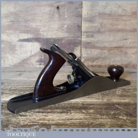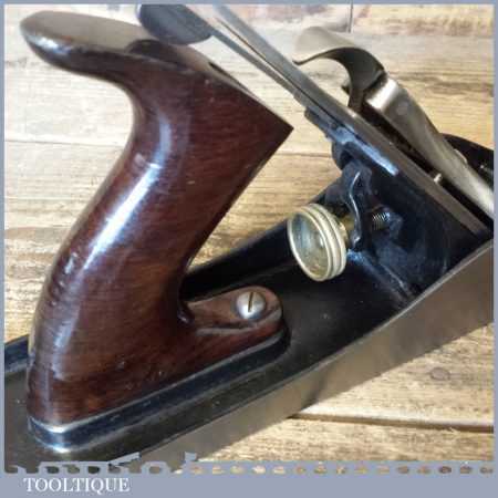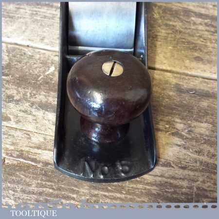 Early antique Stanley USA No: 5 low knob Jack plane with rosewood handle but later replacement English iron, the plane has been fully refurbished and ready for use and is in good used condition.