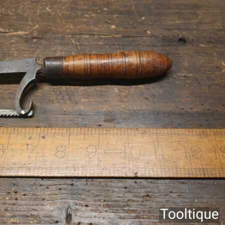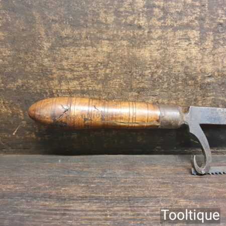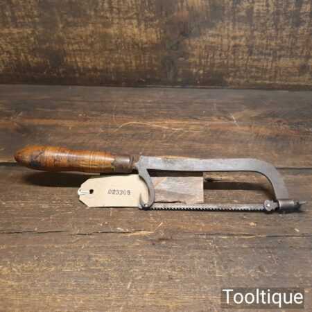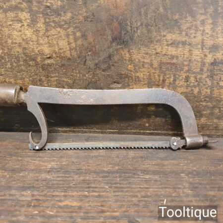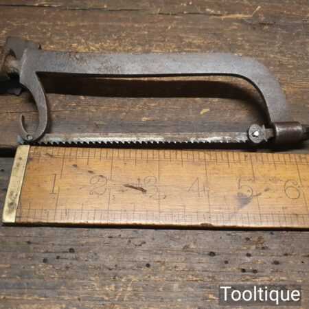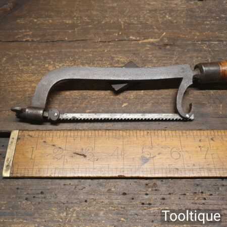Early unusually small antique cast steel 6” Lancashire pattern hacksaw with beechwood handle in good used condition. These saws are uncommon but these are especially scarce when they are in this smaller size.
