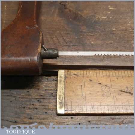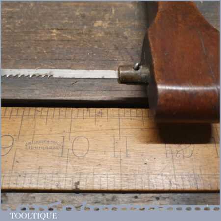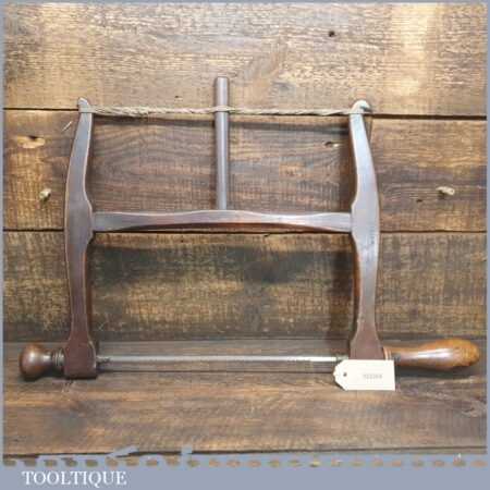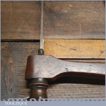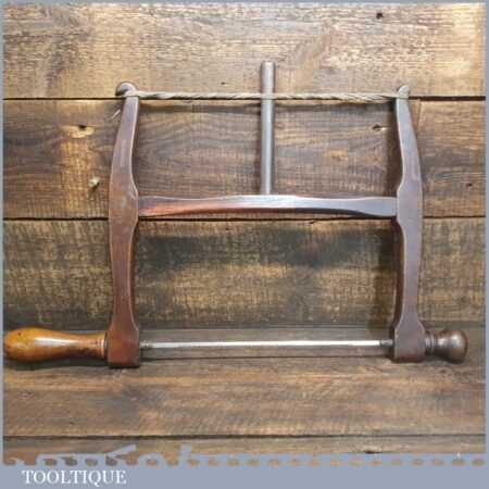 Early vintage boxwood handled beechwood bow saw with a 11” blade that is sharp and in good used condition. Note: Chipped to top of one of the frames.