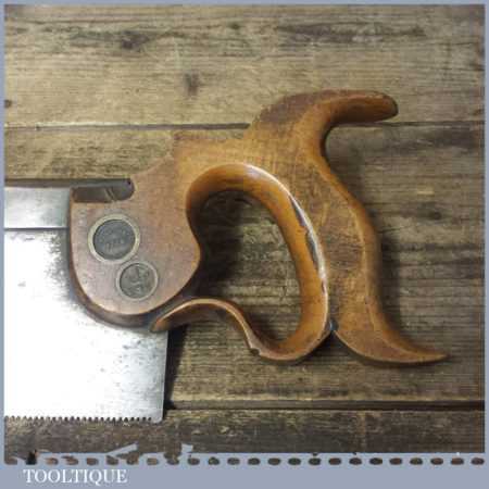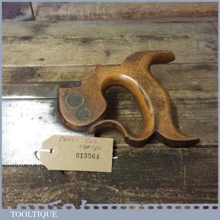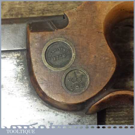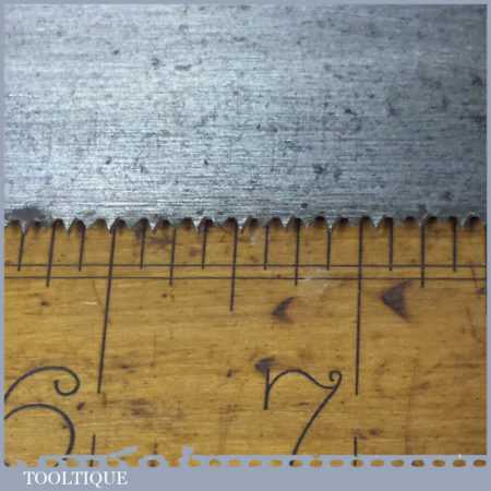 The saw has been thoroughly cleaned including under the handle, jointed, resharpened and set by hand so that all the hard work of getting an old vintage saw right has been undertaken. We do this so that the next sharpening is easier and no more than a quick freshen up would be required. Those who are familiar with sharpening will know this is no small job and requires skill, effort and time to achieve good results