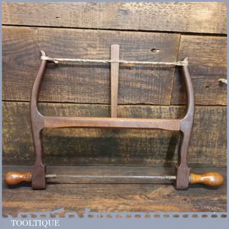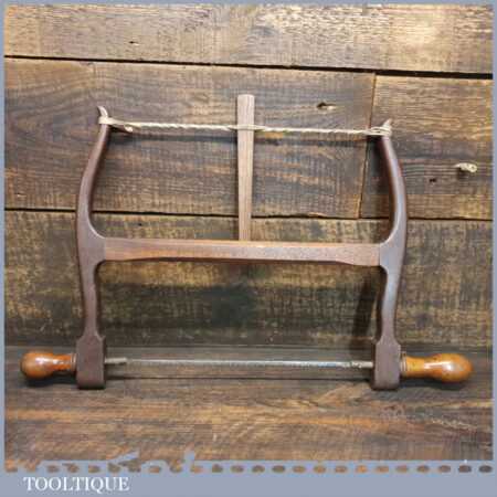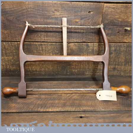 Elegant antique mahogany and boxwood bow saw with sharpened blade in good used condition.