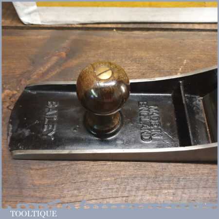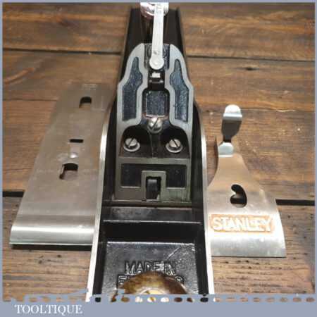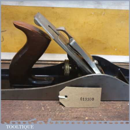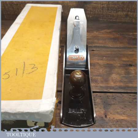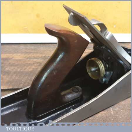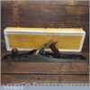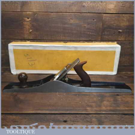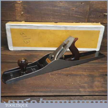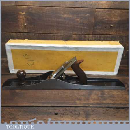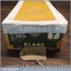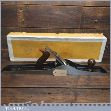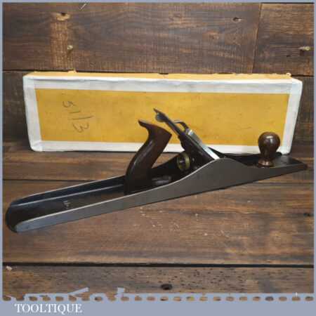 Exceptional vintage boxed Pre-War Stanley England No: 7 jointer plane, in little used condition. Original Rosewood handles and hasn’t seen much use at all if any. These English models with the rosewood handles weren’t produced for long before the war (1937), the introduction of stained beechwood being post war. The box is fragile hence the recent repair to hold it together. Everything is original including the finish on the sole. Probably the best condition Stanley jointer plane I’ve had through my hands to date from this period and you would be hard pressed to find a better example. Premium Quality from a time when Stanley built their highest quality tools.
