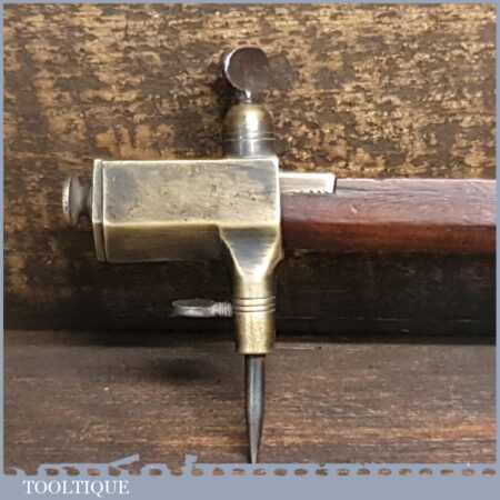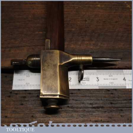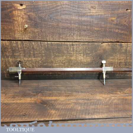 Fabulous quality brass trammel points on hexagon mahogany spacer bar, in good used condition. These are very unusual as one end is fixed but incorporates a fine adjuster whilst the other moves freely, they also have height adjusters, making these trammels well designed but also very rare.
