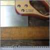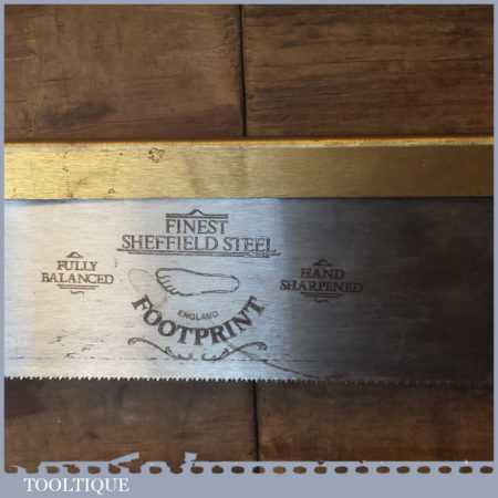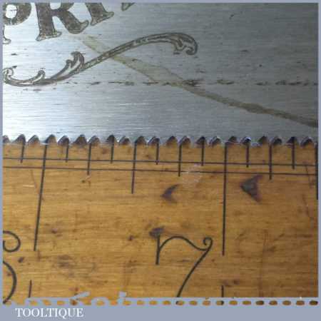 The saw has been thoroughly cleaned including under the handle, jointed, resharpened and set by hand so that all the hard work of getting an old vintage saw right has been undertaken. We do this so that the next sharpening is easier and no more than a quick freshen up would be required. Those who are familiar with sharpening will know this is no small job and requires skill, effort and time to achieve good results.