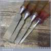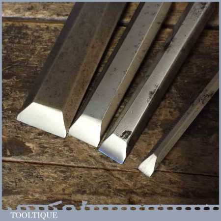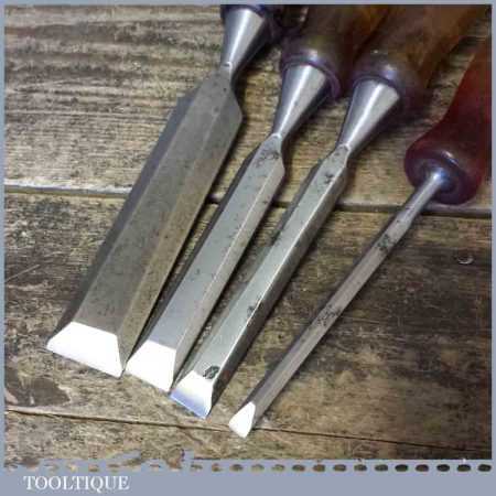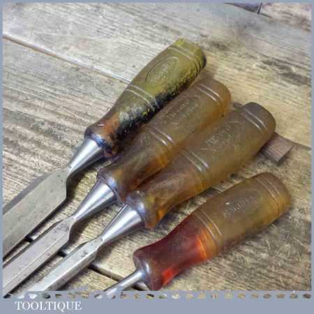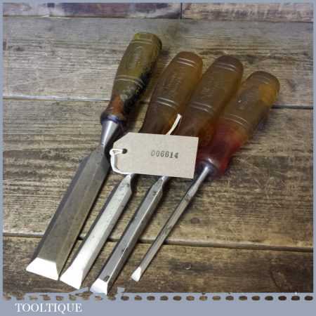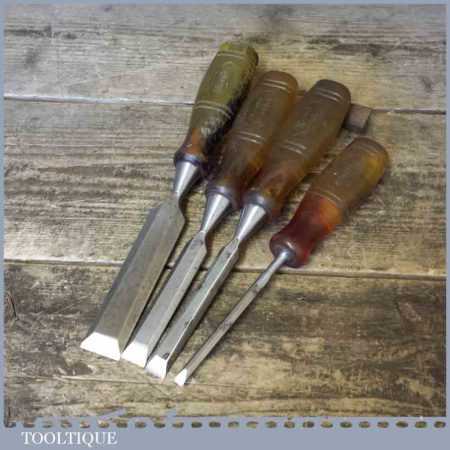 Four vintage Marples M373 bevel edge chisels with shatterproof handles in good usable condition. These are the earlier types which pre dates Irwin which is said by some to have the better quality steel. Sizes ¼” ½” ¾” 1”