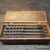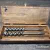 Genuine Antique Boxed Set of 13 No: Russell Jennings USA Carpenters brace auger bits in good used condition. No’s: 3,4,5,6,7,8,9,10,11,12,13,14,16. (i.e. No: 16 x16ths = 1”) Note: No: 15/16″ missing.