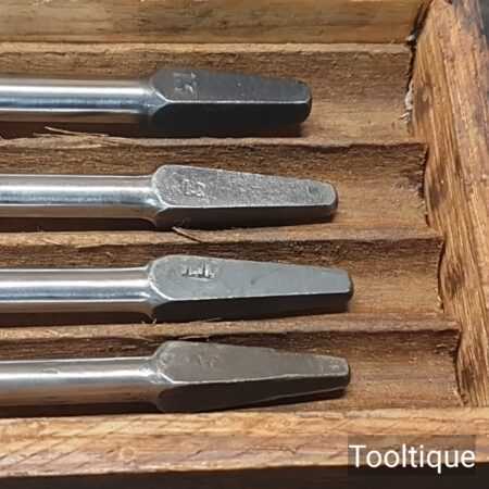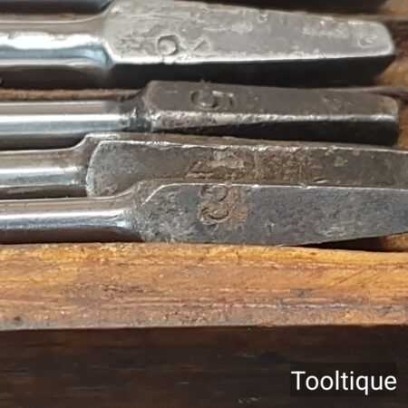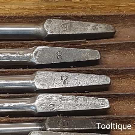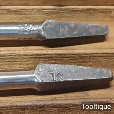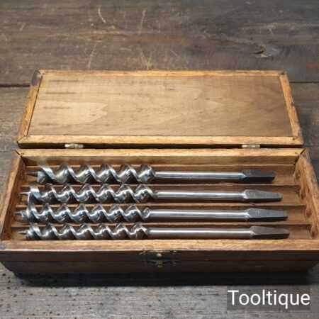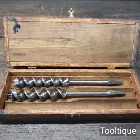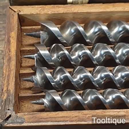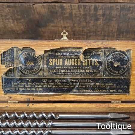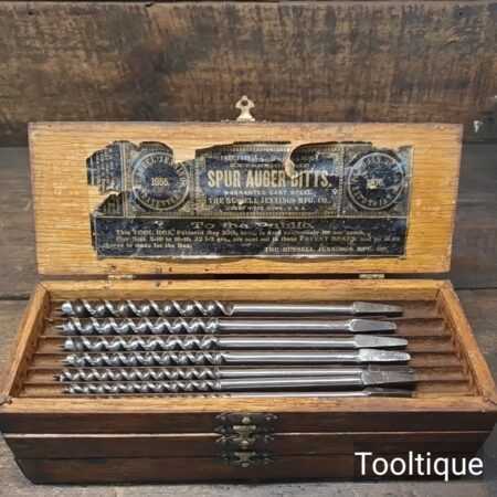 Genuine Antique Boxed Set of 13 No: Russell Jennings USA Carpenters brace auger bits in good used condition. No’s: 3,4,5,6,7,8,9,10,11,12,13,14,16. (i.e. No: 16 x16ths = 1”) Note: No: 15/16″ missing.