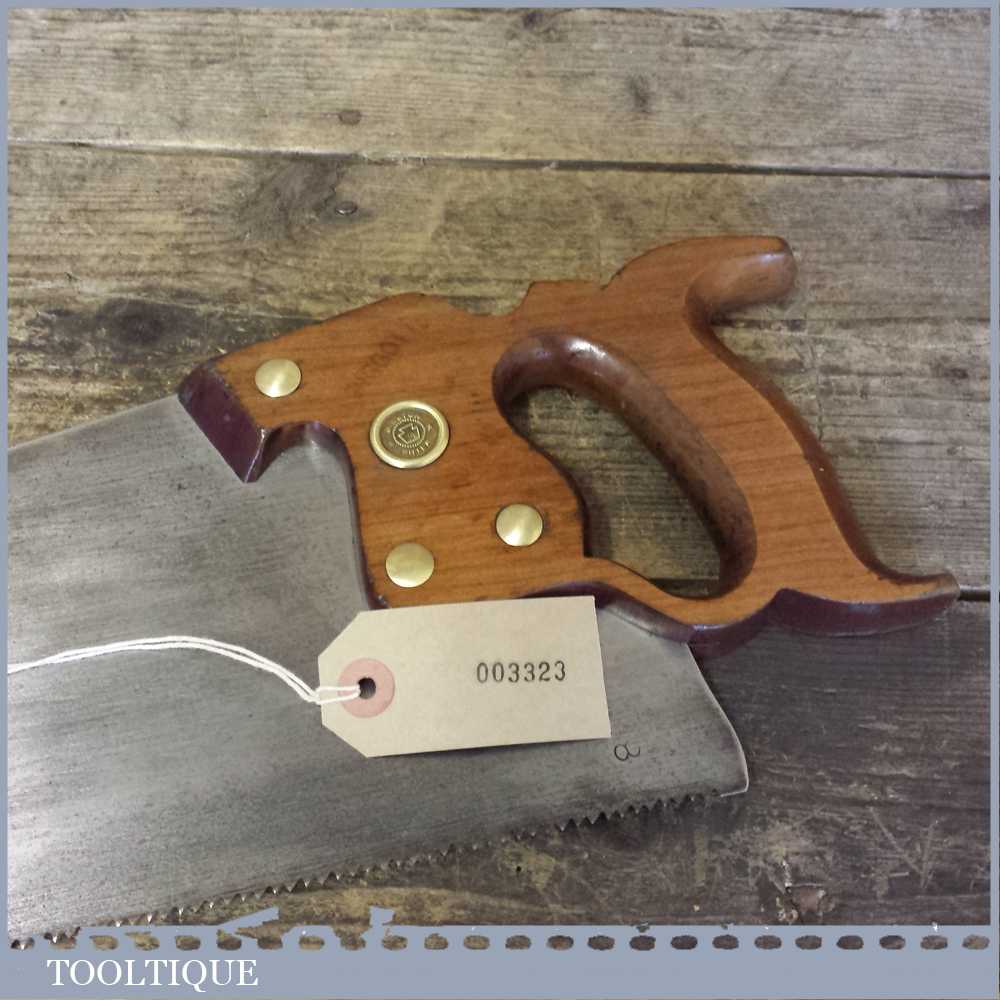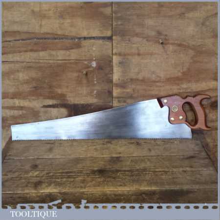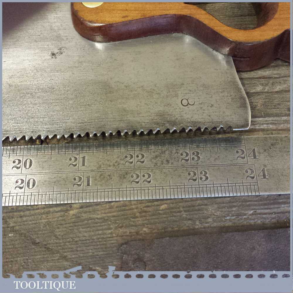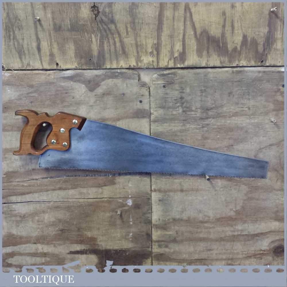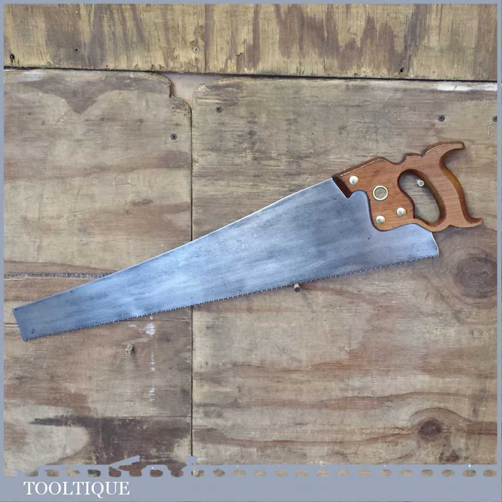 Genuine Henry Disston D7 Philadelphia 8 TPI cross cut saw sharpened & set ready for use. These saws are sort after and collectable but as I see it these are exceptionally good value for craftsmen purchase and use given their superior quality. These saws were often regarded these as the best saws ever produced and have a deserved legendary status in the old tool market. The saw tooth line has been straightened whilst the teeth have been sharpened and set with care making it easier to re-sharpen it again in the future.