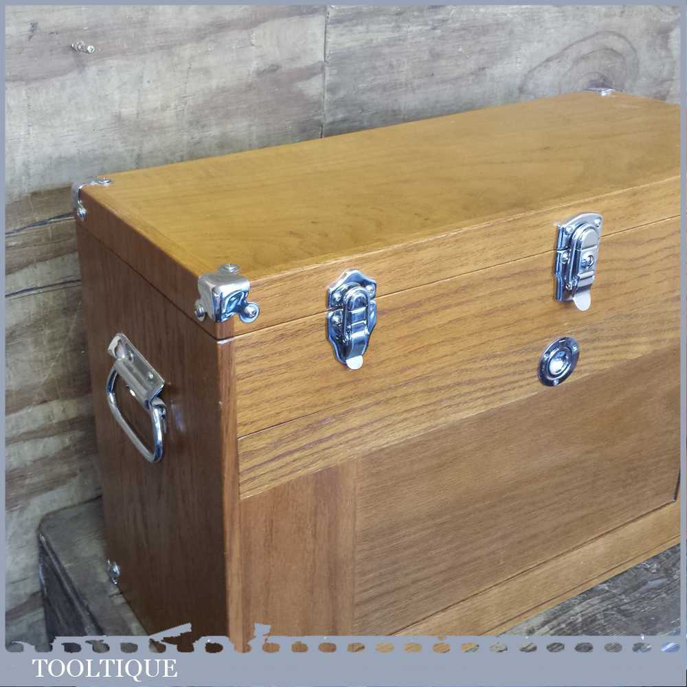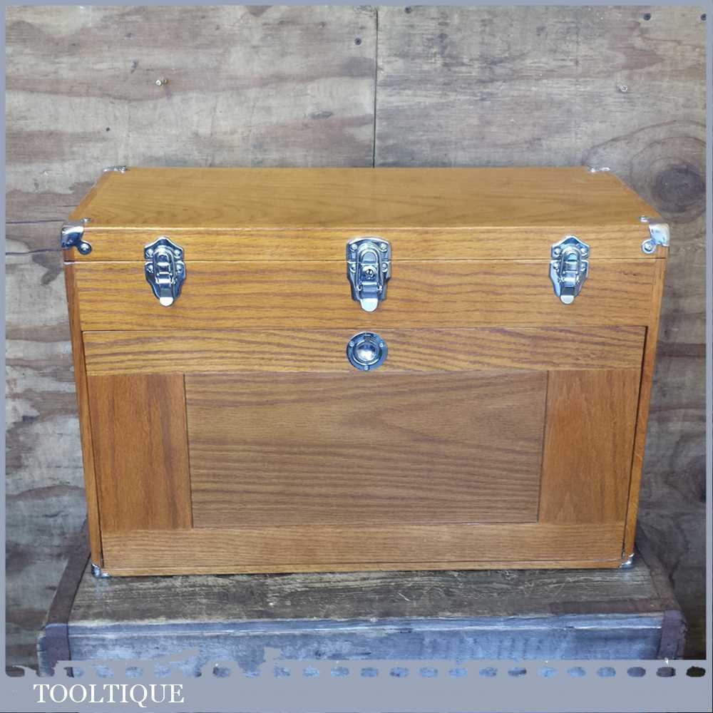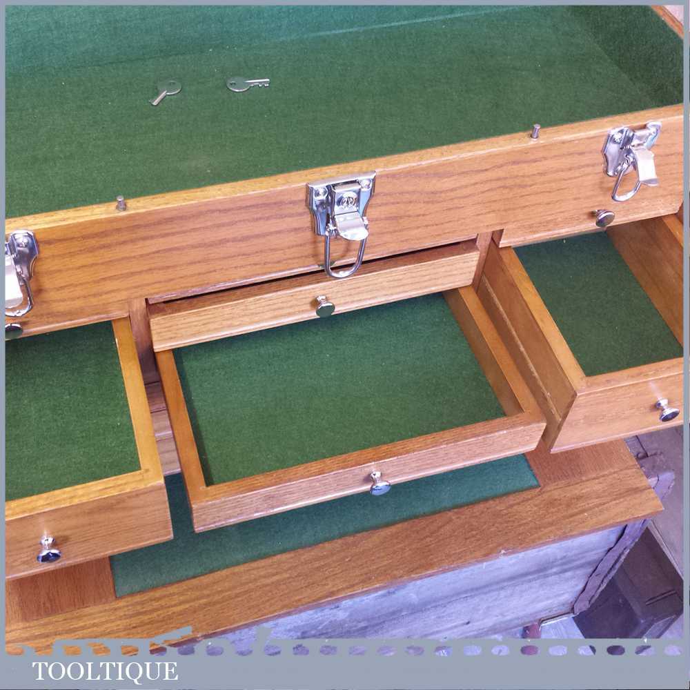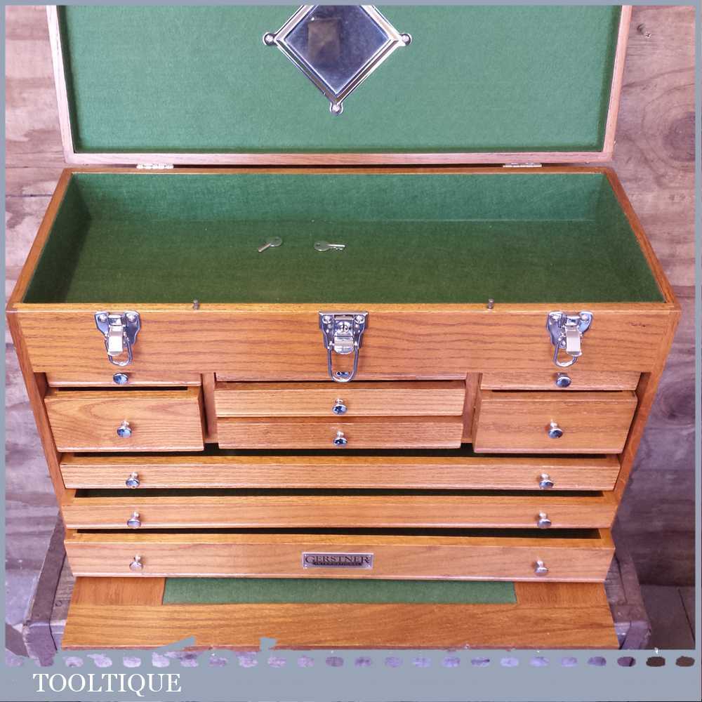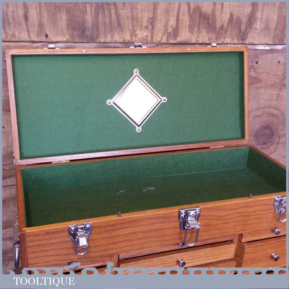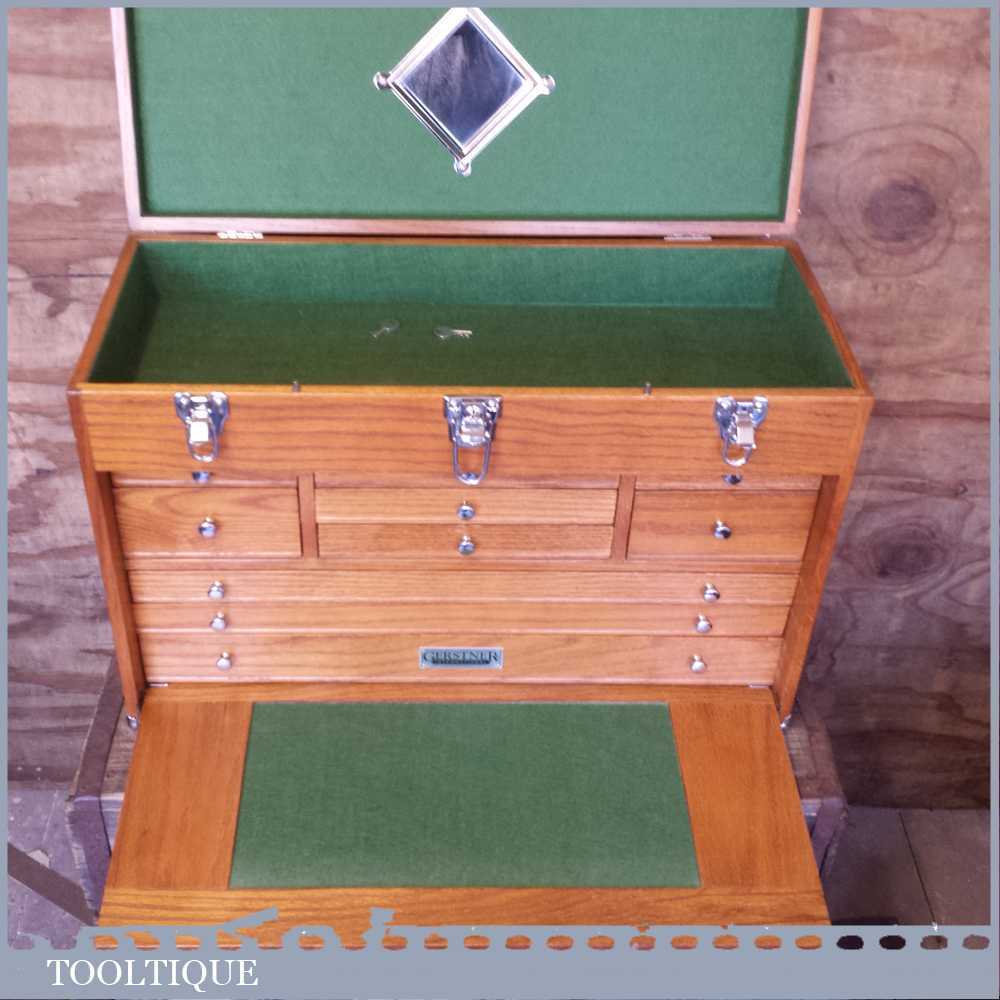 Gerstner International 24” red oak Hobbies or precision tool chest in very good condition. These are perfect for holding small tools and ideal for holding collections, this is an earlier model that has a different draw configuration to the modern ones. Note: this shouldn’t be mistaken with the range Gerstner USA make as these are the cheaper range. However these are very well made boxes and this example has been lightly used and is 1st grade. A modern equivalent usually retails for £359.00 so if you are looking for one of these it’s a big saving. Measures: 24” x 10” x 16” tall.
