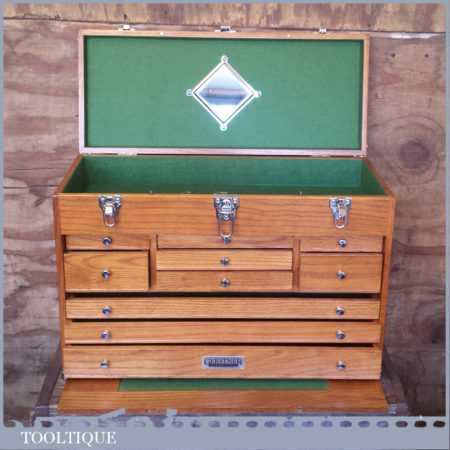 Gerstner International 24” red oak Hobbies or precision tool chest in very good condition. These are perfect for holding small tools and ideal for holding collections, this is an earlier model that has a different draw configuration to the modern ones. Note: this shouldn’t be mistaken with the range Gerstner USA make as these are the cheaper range. However these are very well made boxes and this example has been lightly used and is 1st grade. A modern equivalent usually retails for £359.00 so if you are looking for one of these it’s a big saving. Measures: 24” x 10” x 16” tall.