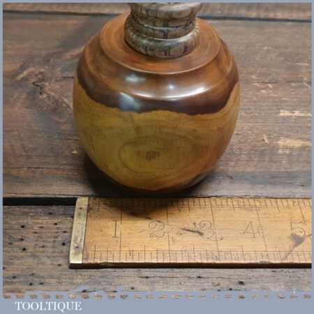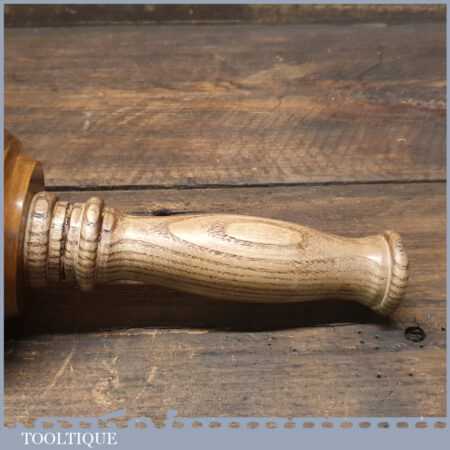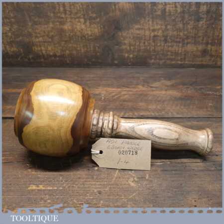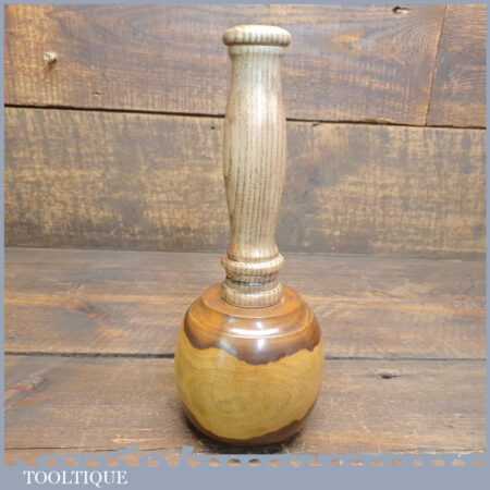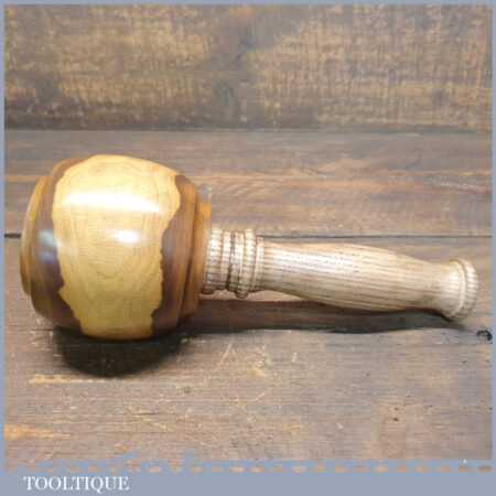 Handmade wood turned reclaimed old lignum vitae mallet with ash handle and ebony wedge. This mallet weighs 1lb 4oz and is finished with bee’s wax. Note: This has wonderful figuring in the lignum which isn’t a common feature from crown bowls and adds extra beauty to the mallet.
