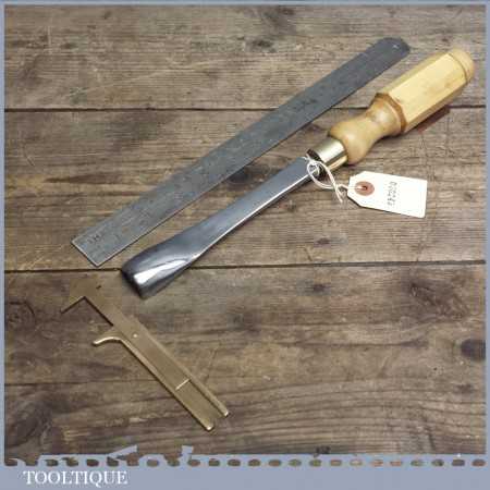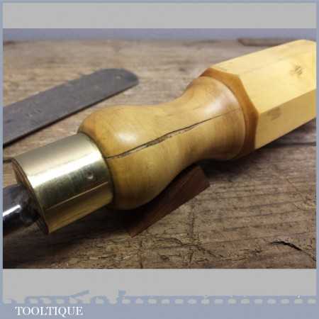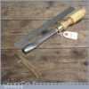 Large vintage forged steel carving chisel probably Japanese in good condition and has been sharpened & honed ready for use, this spoon gouge measures approx 1 3/8” wide, with London pattern boxwood handle, Note this has a crack near the ferule but is stable.