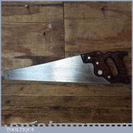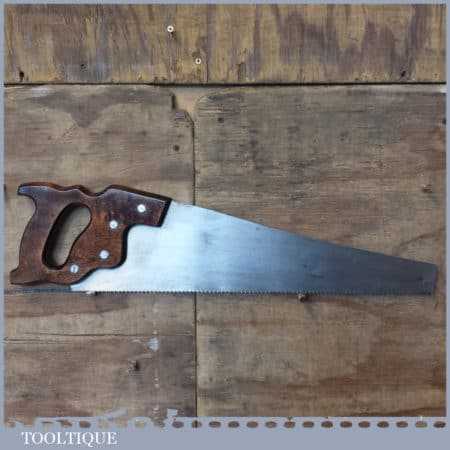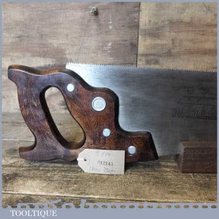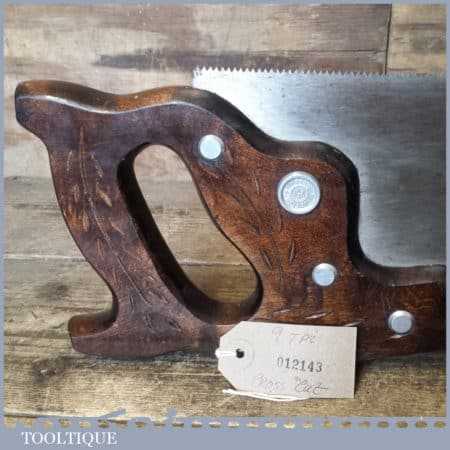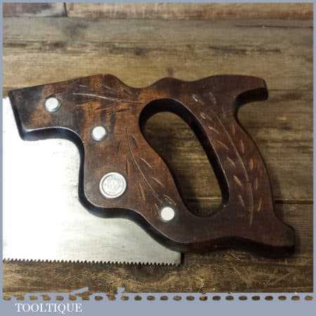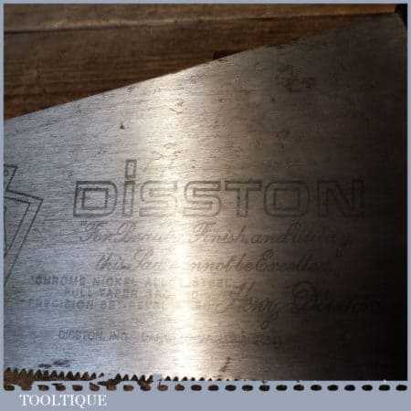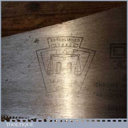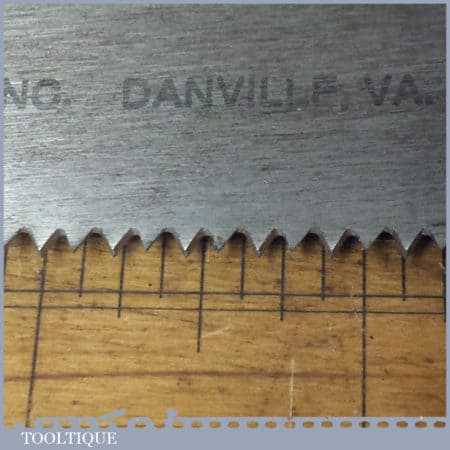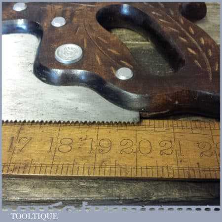 The saw has been thoroughly cleaned, jointed, resharpened and set by hand so that all the hard work of getting an old vintage saw right has been undertaken. We do this so that the next sharpening is easier and no more than a quick freshen up would be required. Those who are familiar with sharpening will know this is no small job and requires skill, effort and time to achieve good results