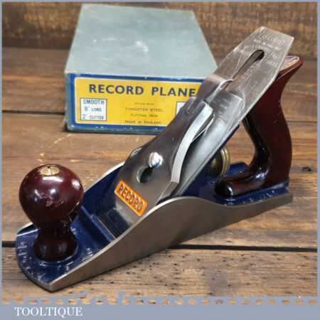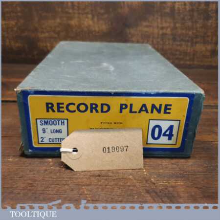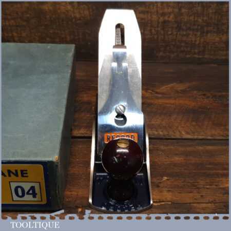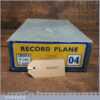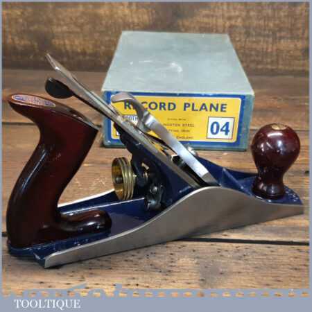 Near mint vintage boxed Record No: 04 smoothing plane in little used condition. Manufactured between 1952-58. Lapped flat to improve its accuracy but hard to think where you would find a better example