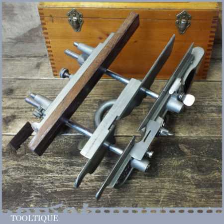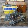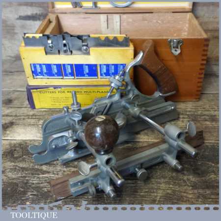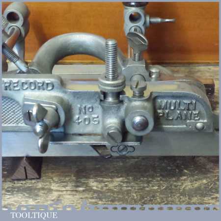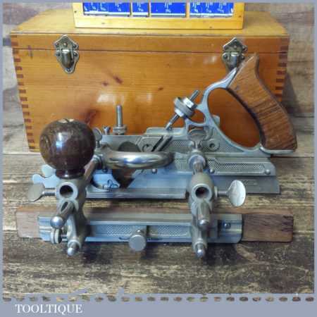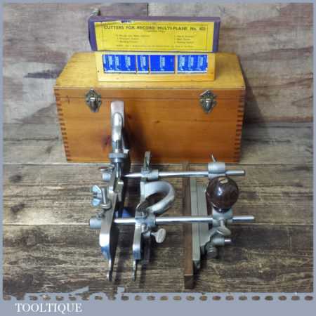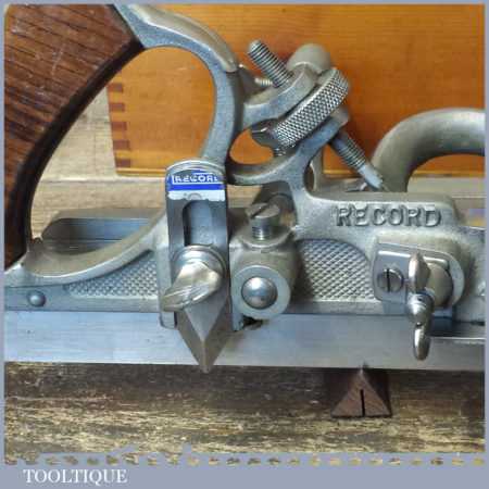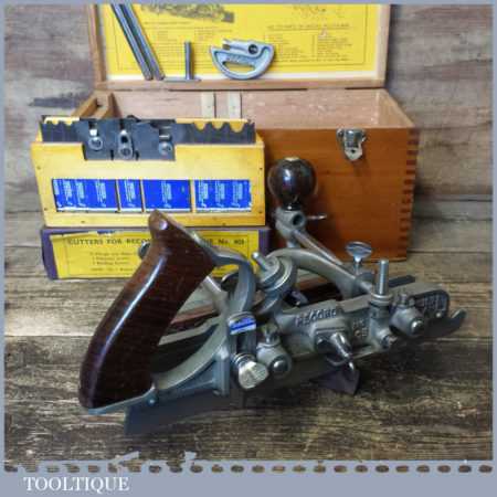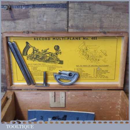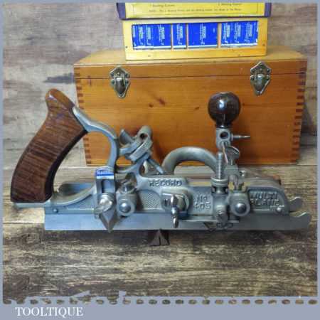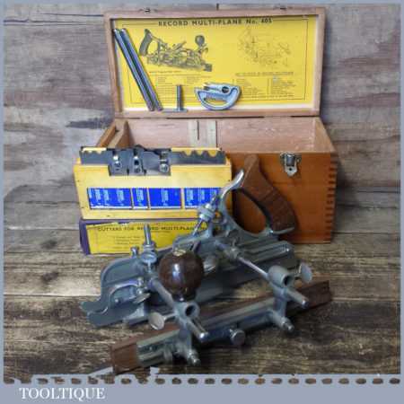 Near mint vintage boxed Record No: 405 combination plough plane complete with 22 cutters. The plane is in little used condition and all components move smoothly and the plane has rosewood handles. Note: We do not sharpen the irons although these will be in good used condition.