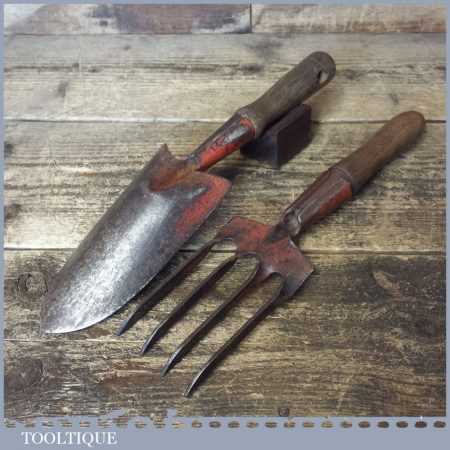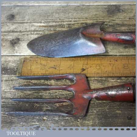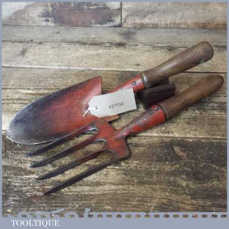 Nice vintage English made gardener’s fork and trowel set with beechwood handles, in good used condition.
