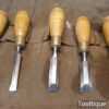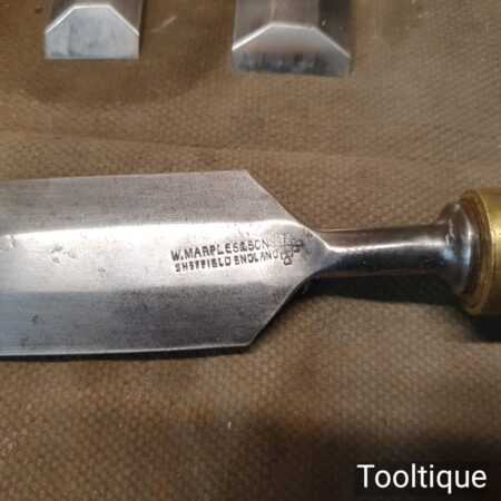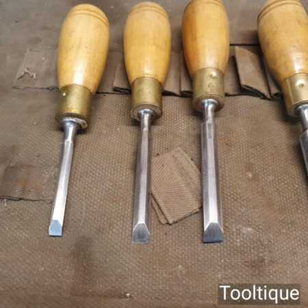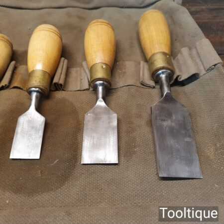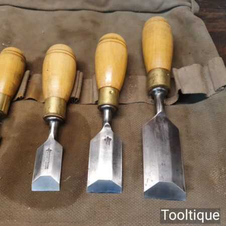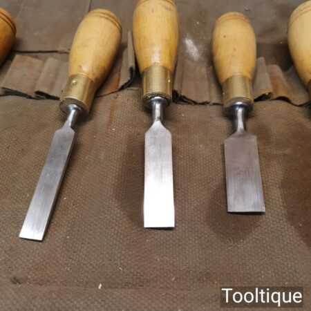 Nice vintage Set of 9 W. Marples & Sons Shamrock Brand (1 ½”, 1 ¼”, 1″, ¾”, ⅝”, ½”, ⅜”, ¹¹⁄₃₂”, ¼”) Palm chisels with hardwood handles in a heavy canvass roll. In good used condition, fully refurbished, sharpened and honed ready for use.