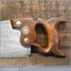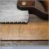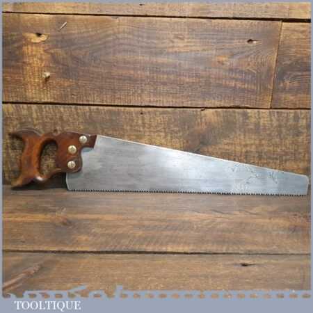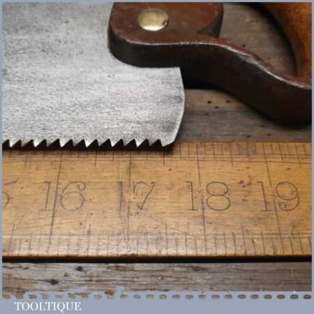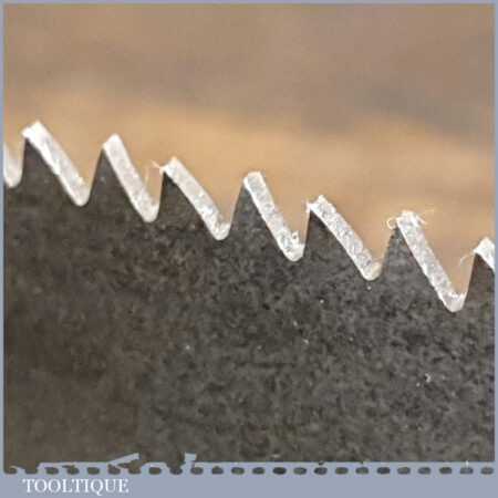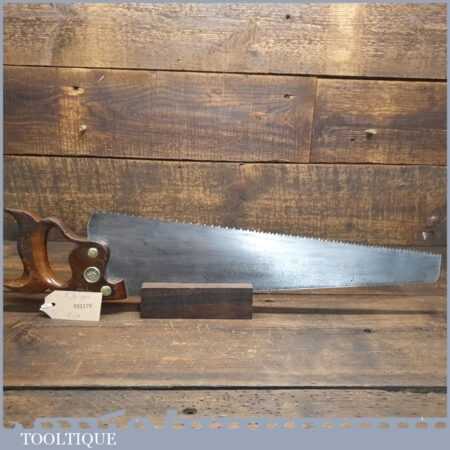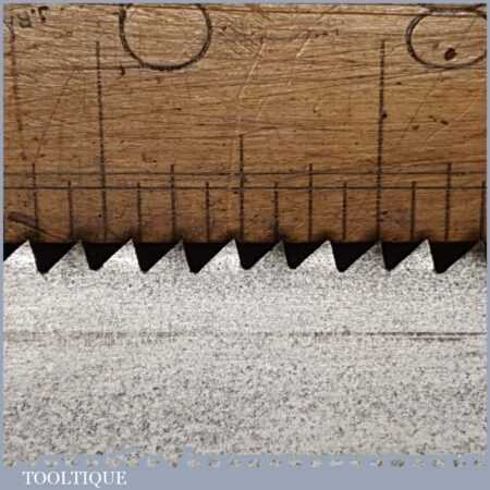 The saw has been thoroughly cleaned, jointed, resharpened and set by hand so that all the hard work of getting an old vintage saw right has been undertaken. We do this so that the next sharpening is easier and no more than a quick freshen up would be required. Those who are familiar with sharpening will know this is no small job and requires skill, effort and time to achieve good results.