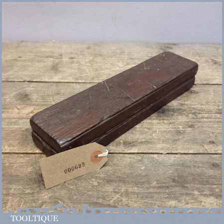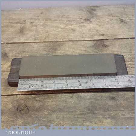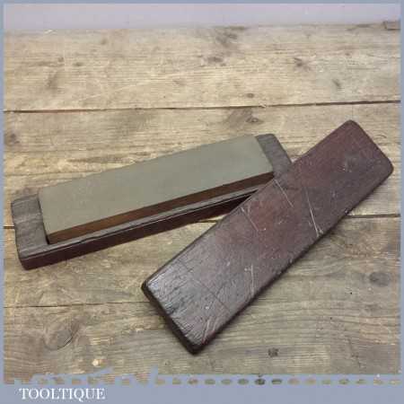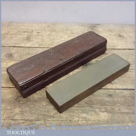 Old vintage medium grit honing oil stone in a wooden box, the stone measures 8” long and 2” wide. Please check the images carefully as this is part of the description as all minor imperfections will be shown if there are any.
