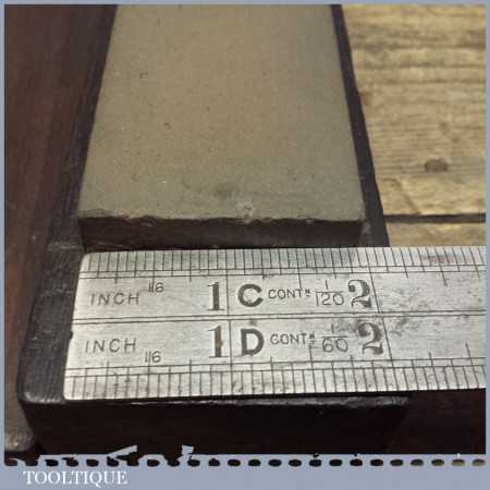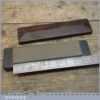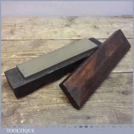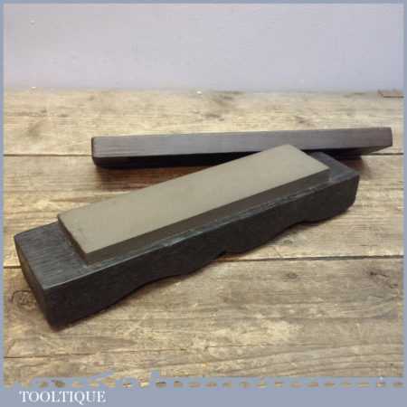 Old vintage medium grit sharpening oil stone in a wood box, the stone measures 8” long and 2” wide in good used condition.