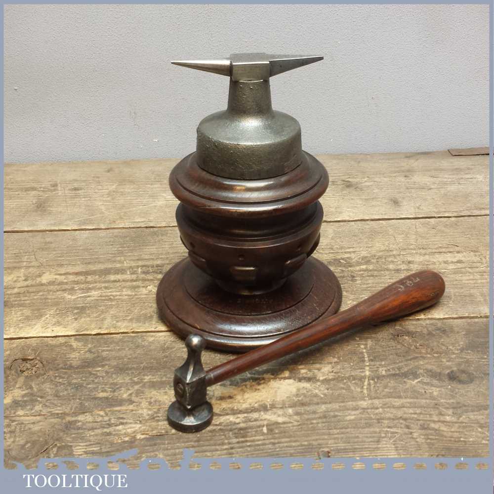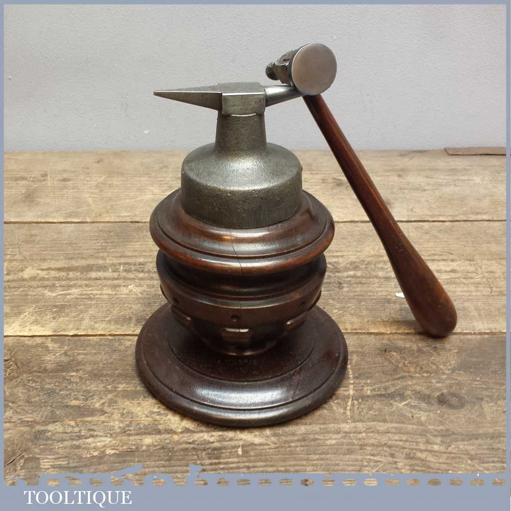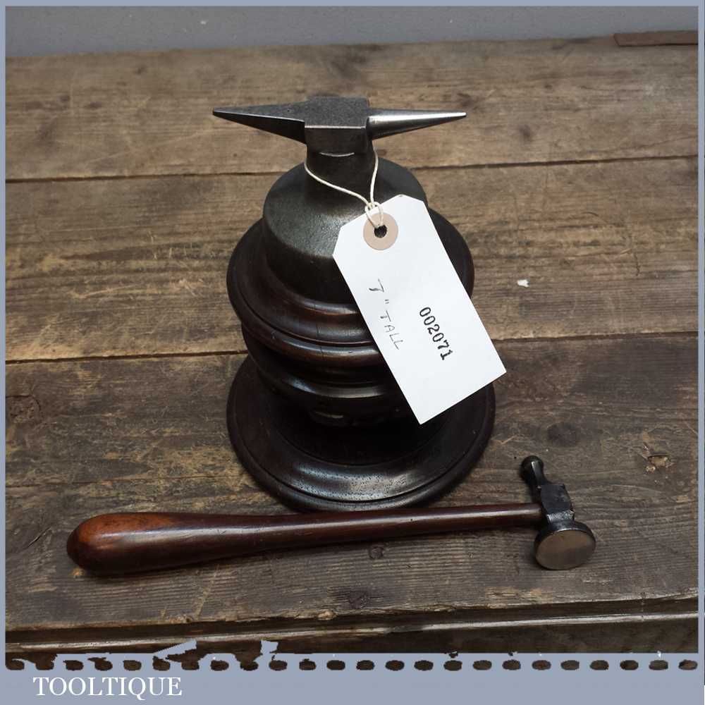 Ornate antique 19th century Jeweller’s Anvil on a mahogany stand with a very small planishing hammer with rosewood handle. This is certainly a set that would grace any tool collection or would be perfect for a jeweller whose work has a sense of history to their design. Note: there is an age crack in the main body but is quite stable.