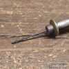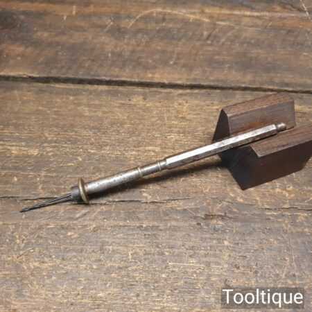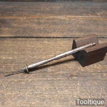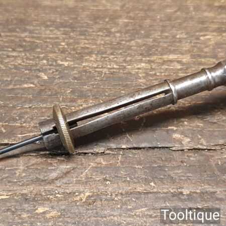 Ornate antique clockmakers hand drill or bit holder in good used condition. The brass ring slides down to clamp small bits.
