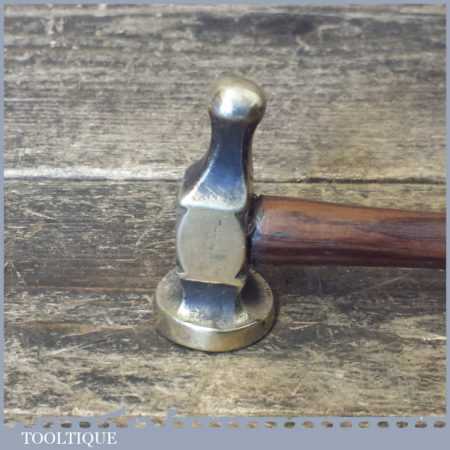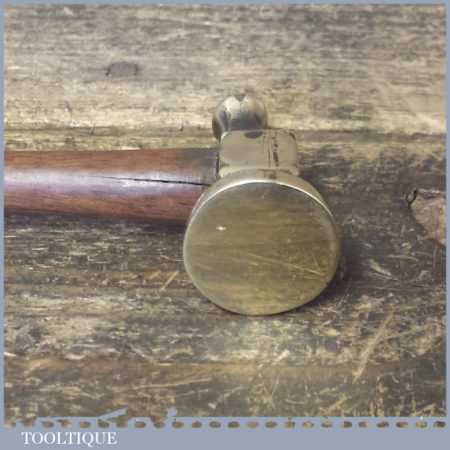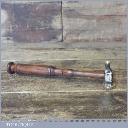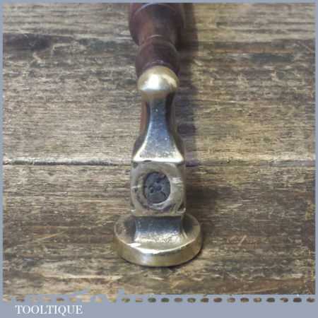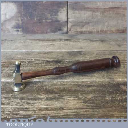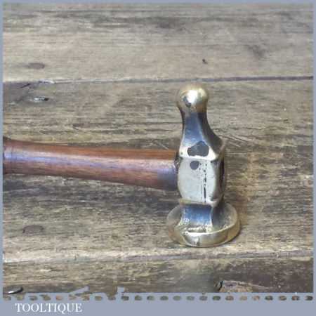 Fine ornate antique jeweller’s brass repousse hammer with decorative turned mahogany handle in good used condition.