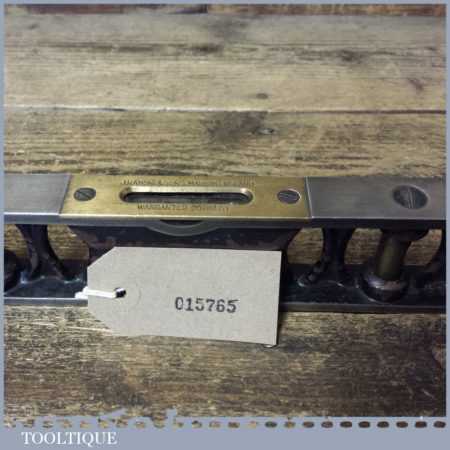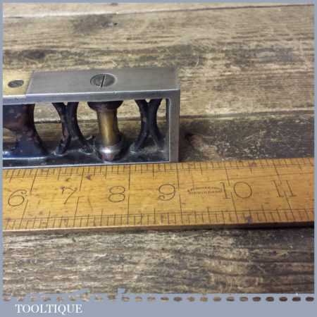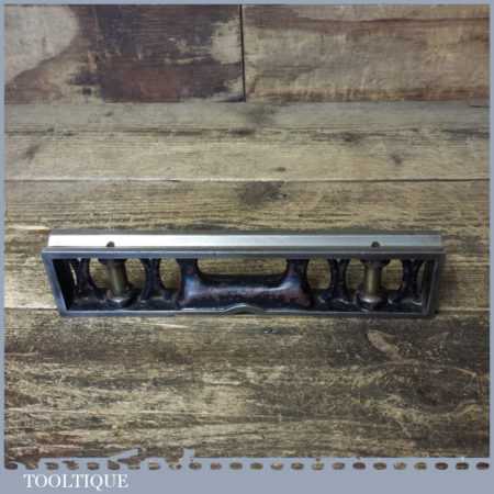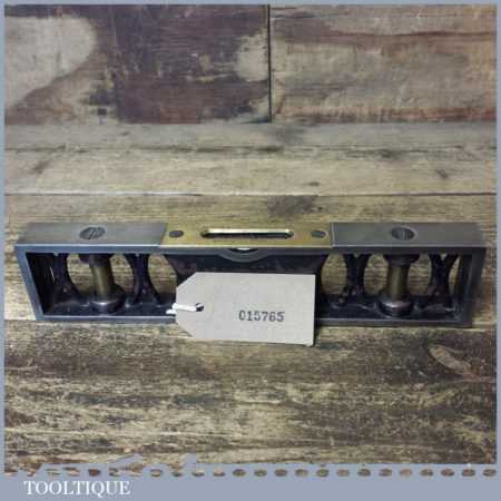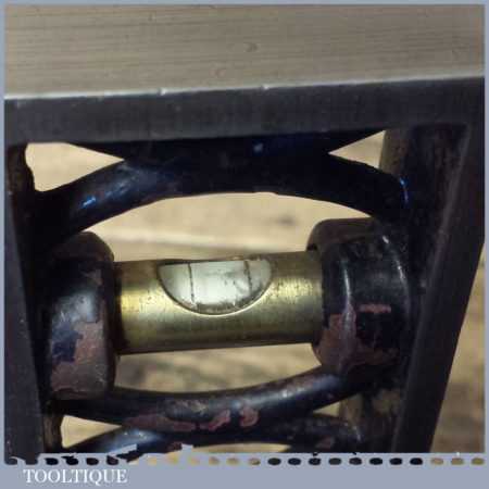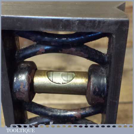Ornate vintage J. Rabone & Sons 9” cast steel and brass machinists spirit level with a V block type base in good used condition. Note: the level hasn’t been tested and may require resetting if intended for use