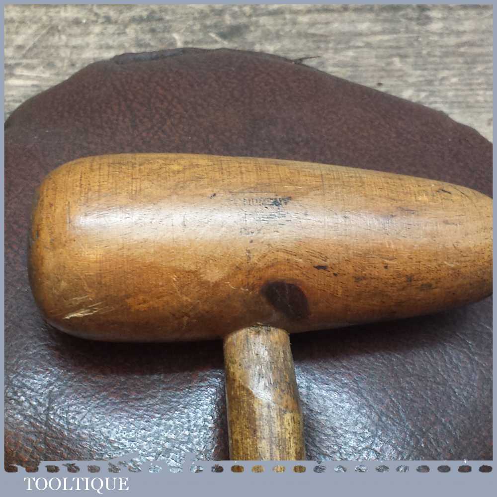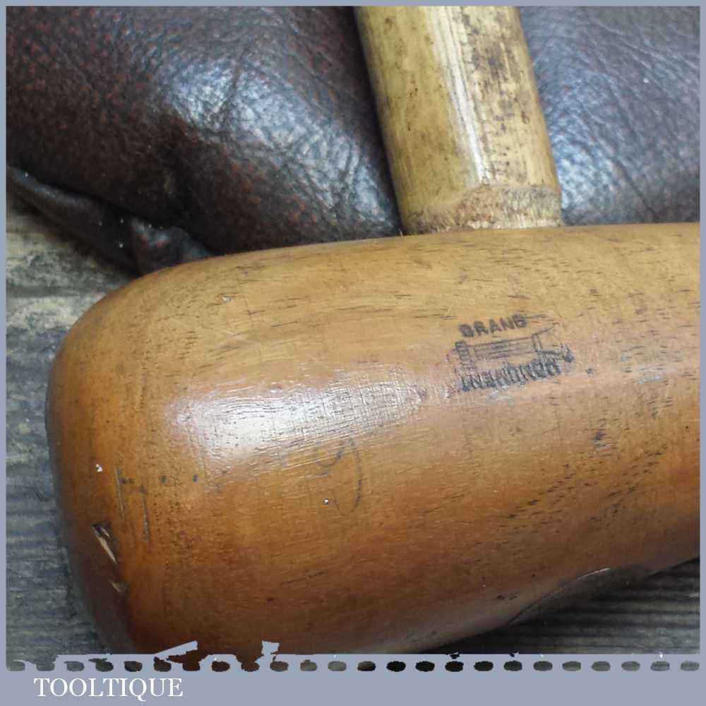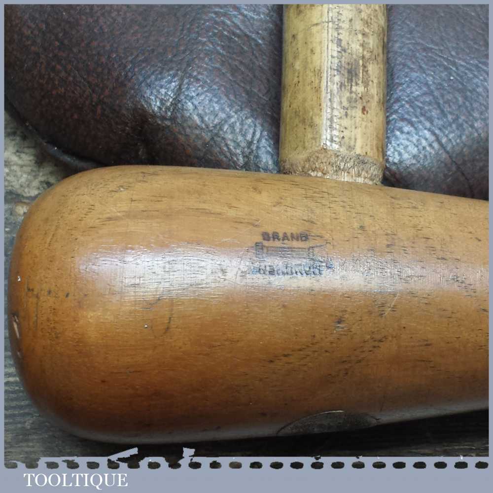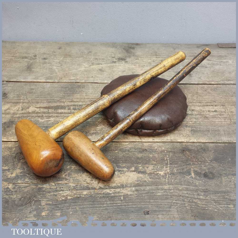 Pair of boxwood metal working bossing mallets with cane handles and a leather sandbag. Note: The sandbag does leak small amounts of sand through the stitching but it’s a handy thing to have with these mallets.