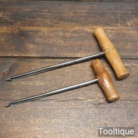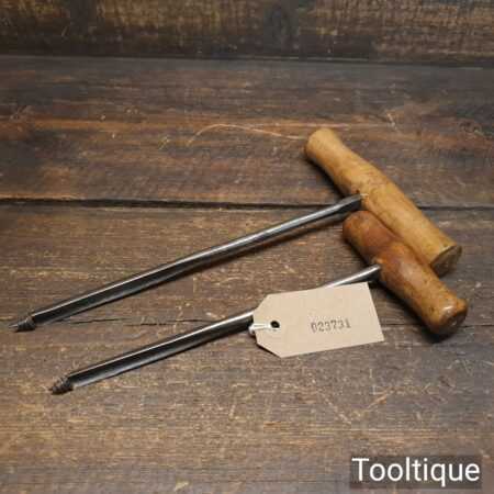 Pair of vintage flat tang shell gimlets 3/8” + 13/32” with beechwood handles in good used condition.