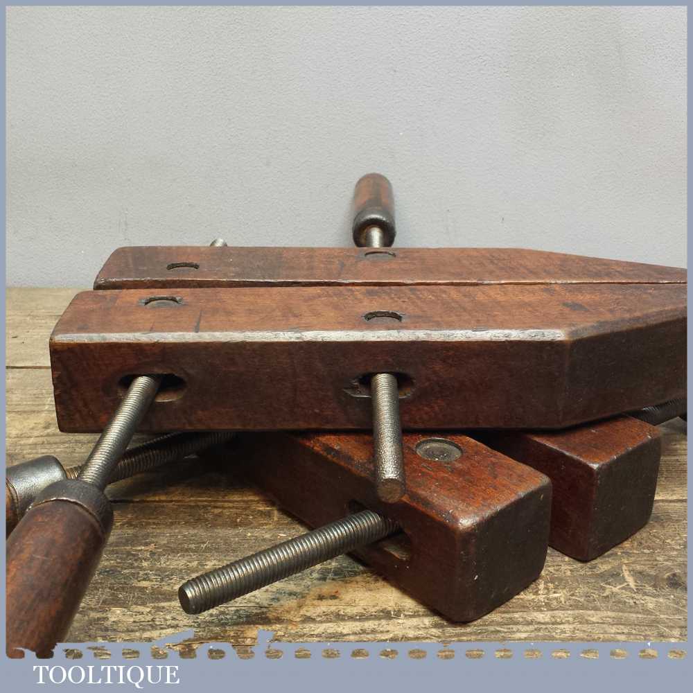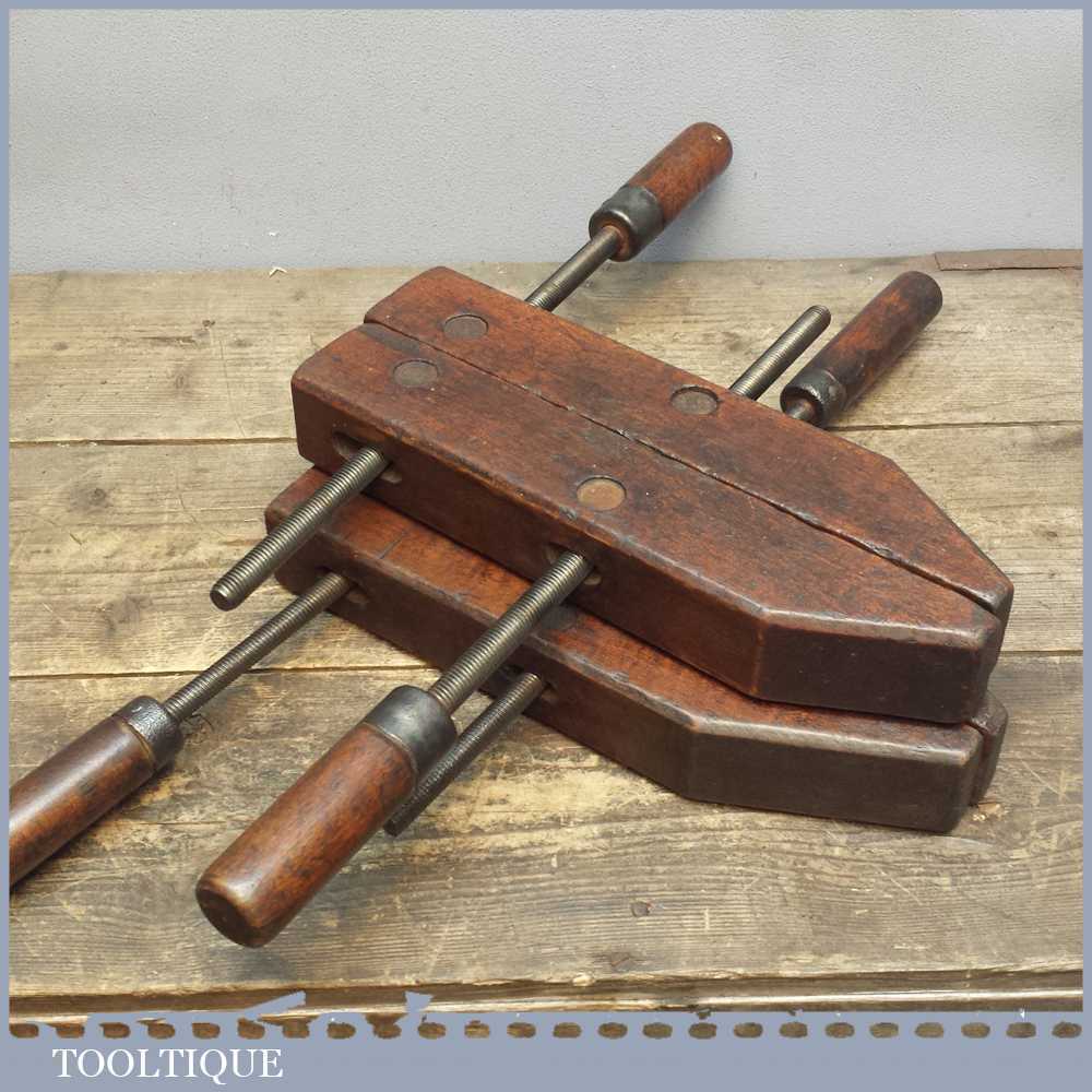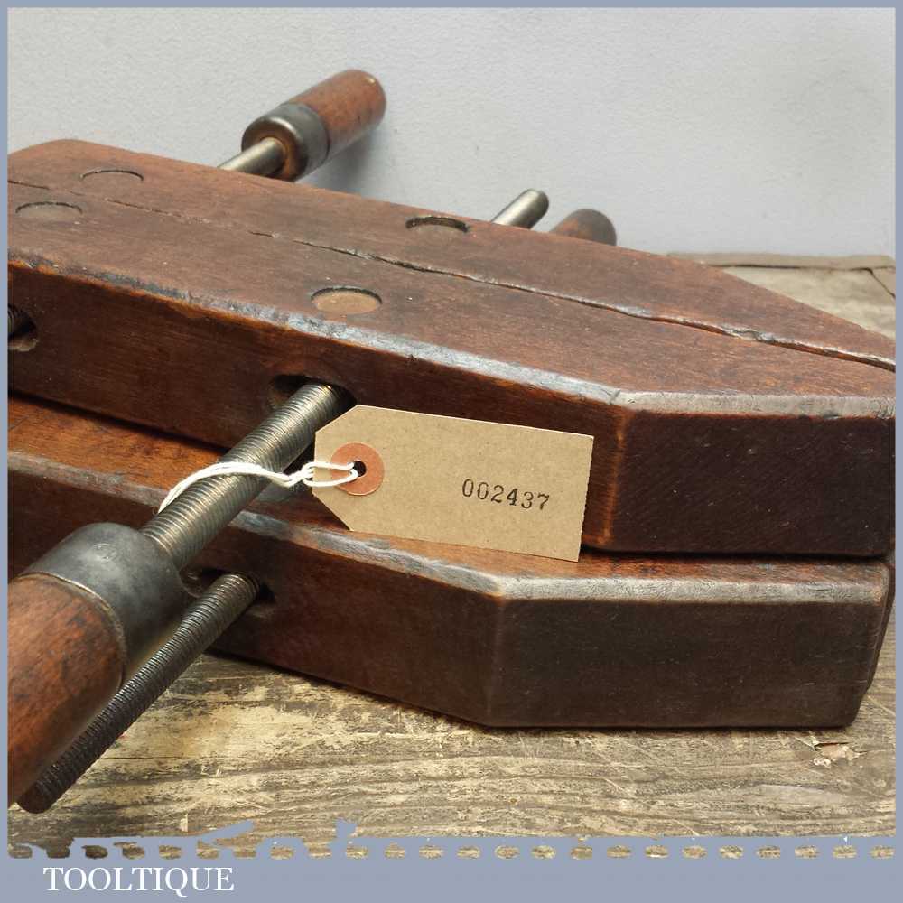 Pair of vintage wooden adjustable clamps which are named although it is illegible beneath the mark “adjustable clamp” but were obviously factory made. These have a very good look to them and look the part in a tool collection as well as being in good useable condition.