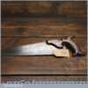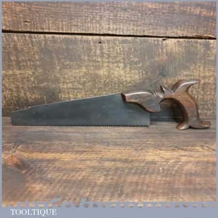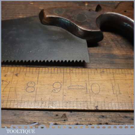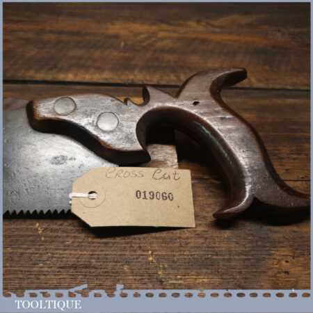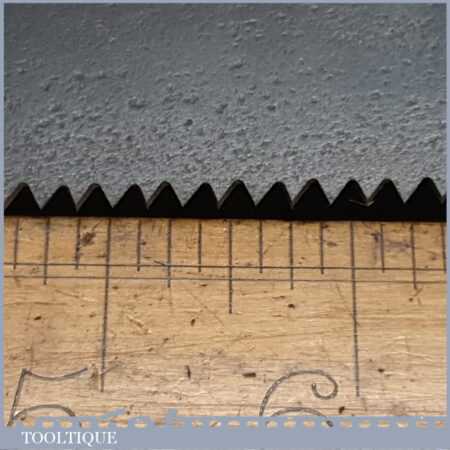 The saw has been thoroughly cleaned, jointed, resharpened and set by hand so that all the hard work of getting an old vintage saw right has been undertaken. We do this so that the next sharpening is easier and no more than a quick freshen up would be required. Those who are familiar with sharpening will know this is no small job and requires skill, effort and time to achieve good results.