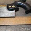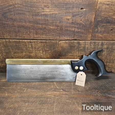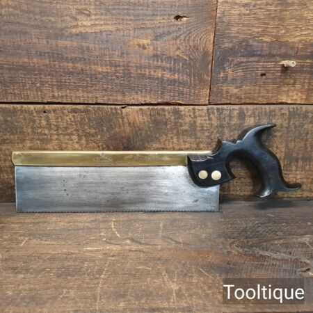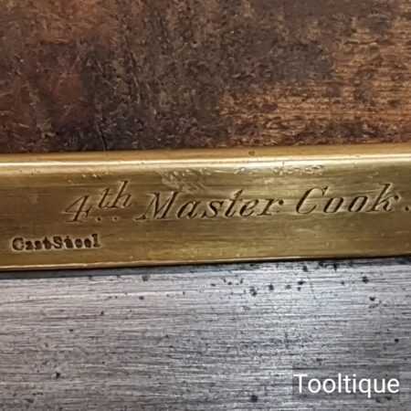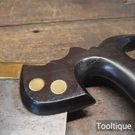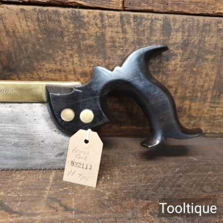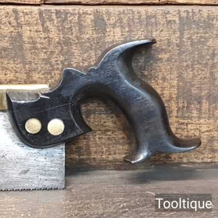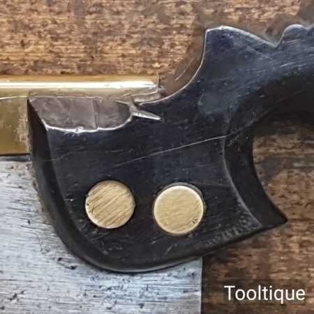 Rare Antique 12” Harrison Brothers & Howson of Sheffield Brass Back Hand Saw with an Ebony Handle sharpened Crosscut with 11 Tpi, fully refurbished ready for use and in good used condition. This company were renowned master cutlers who produced very high-quality goods and the saw itself was likely to have been made for them by a true pure saw maker, possibly in part as the ebony handle is a high-quality addition. The 4th Master Cook refers to the original user being capable of working to high standards with many years of experience. Note: Sharpened well incorporating all three disciplines of slope, rake and fleam and it has a good quality saw plate. The handle was damaged and has been repaired with high quality wood glue and now has an internal screw to improve strength, cosmetically resin filled to disguise the repair and feels great again in the hand. It’s a lovely saw that needed a lot of TLC but the results show it was worth the effort.
