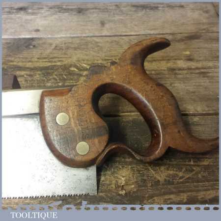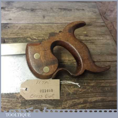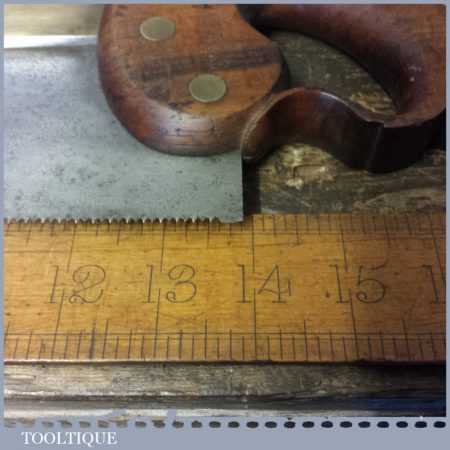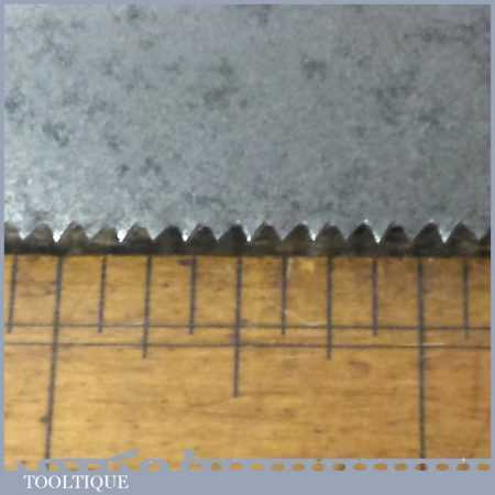 The saw has been thoroughly cleaned, jointed, resharpened and set by hand so that all the hard work of getting an old vintage saw right has been undertaken. We do this so that the next sharpening is easier and no more than a quick freshen up would be required. Those who are familiar with sharpening will know this is no small job and requires skill, effort and time to achieve good results.