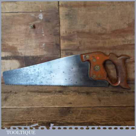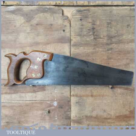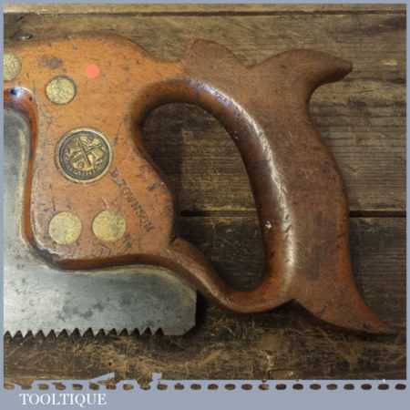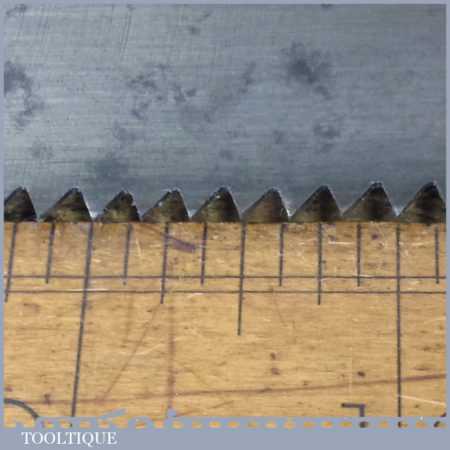 The saw has been thoroughly cleaned, jointed, resharpened and set by hand so that all the hard work of getting an old vintage saw right has been undertaken. We do this so that the next sharpening is easier and no more than a quick freshen up would be required. Those who are familiar with sharpening will know this is no small job and requires skill, effort and time to achieve good results.