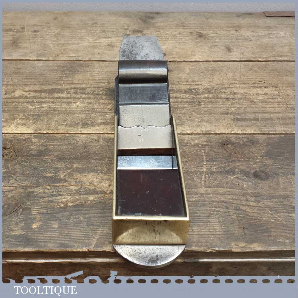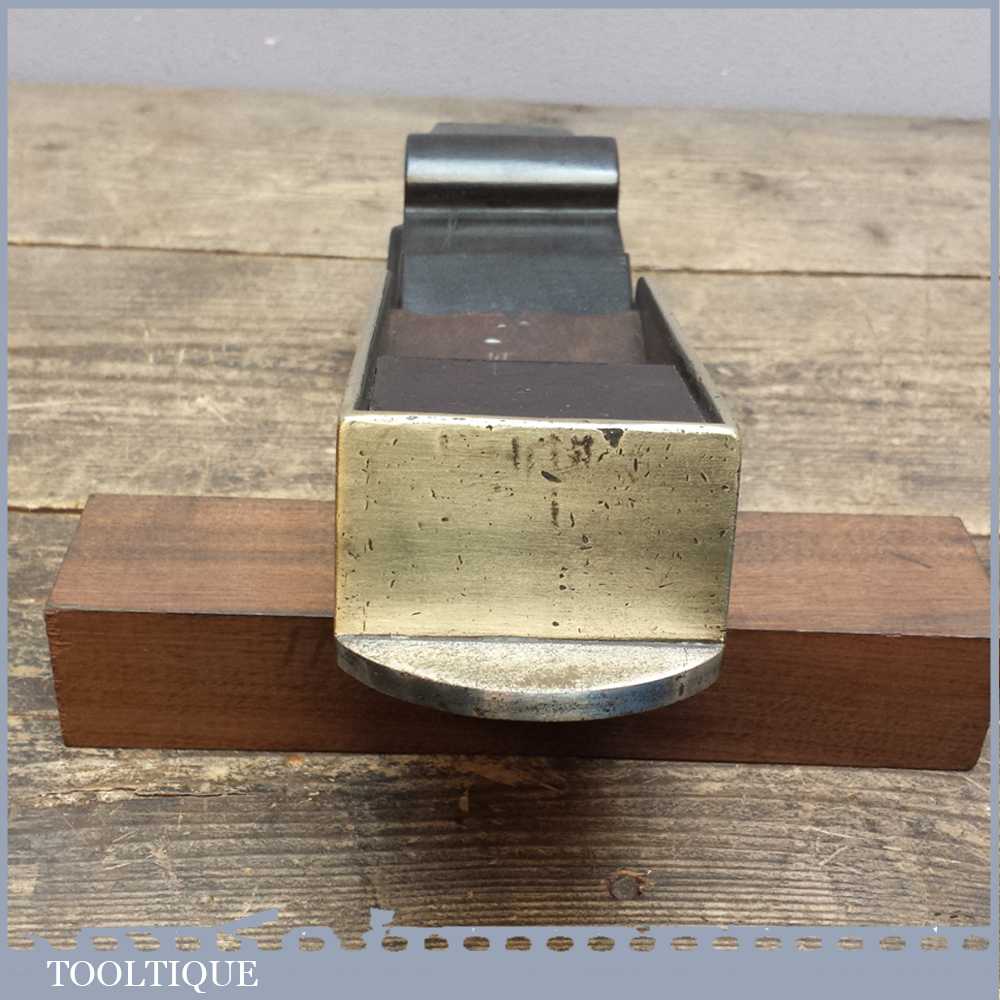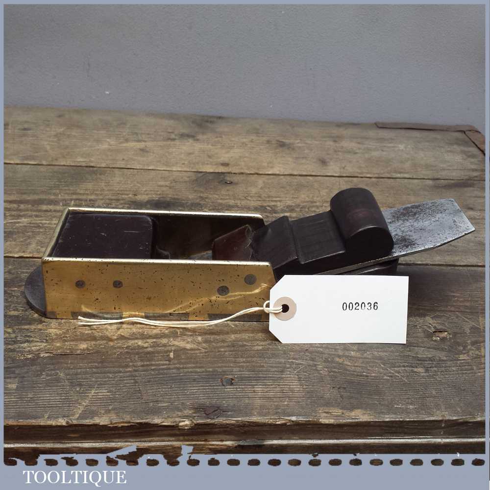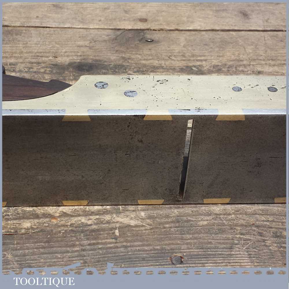 A rare Antique early 19th century Dovetailed Brass & rosewood infill mitre plane with an unusual shaped rear which is in good overall condition for its age. There is evidence that this plane has been designed like this at the rear of the plane where the sole has been worn over time when removing the iron as it would have been rounded like the front. Similar planes are illustrated in Russell’s book although none with the rosewood showing at the back. The iron has been replaced at some time and collectors would be aware isn’t original as it would have a sneck but these can be found. Sold as collectable only.