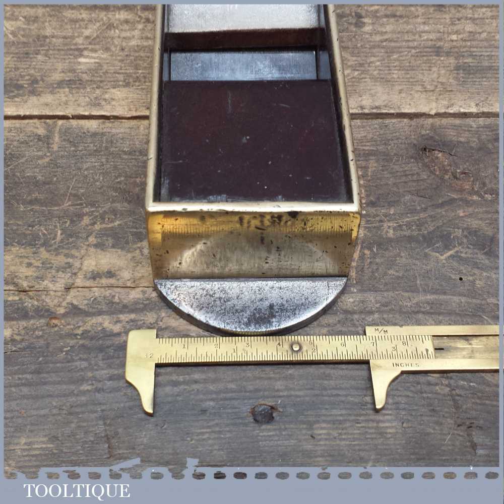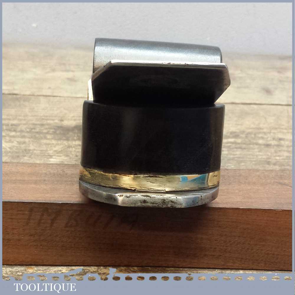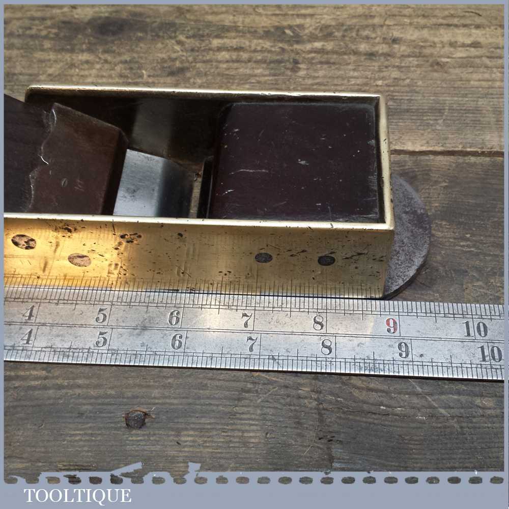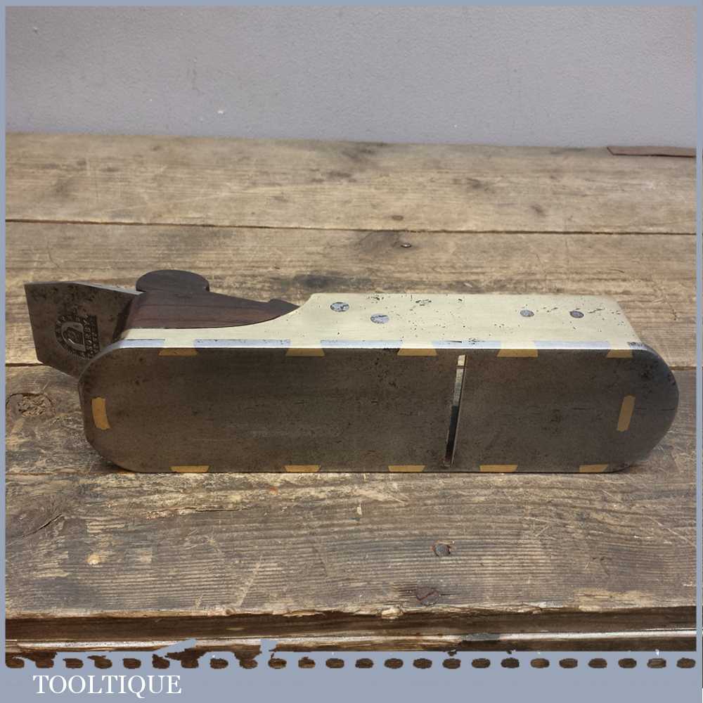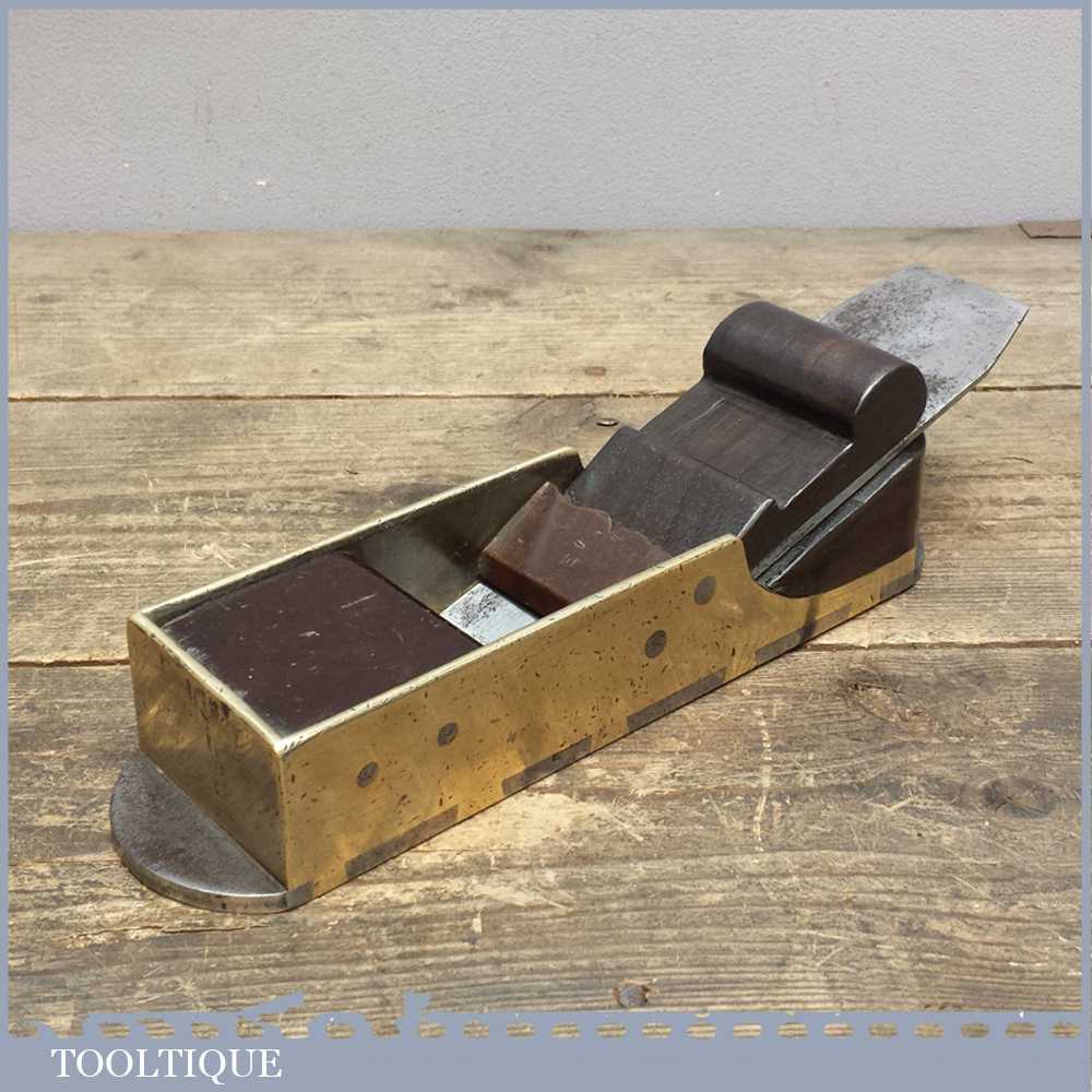 A rare Antique early 19th century Dovetailed Brass & rosewood infill mitre plane with an unusual shaped rear which is in good overall condition for its age. There is evidence that this plane has been designed like this at the rear of the plane where the sole has been worn over time when removing the iron as it would have been rounded like the front. Similar planes are illustrated in Russell’s book although none with the rosewood showing at the back. The iron has been replaced at some time and collectors would be aware isn’t original as it would have a sneck but these can be found. Sold as collectable only.