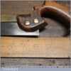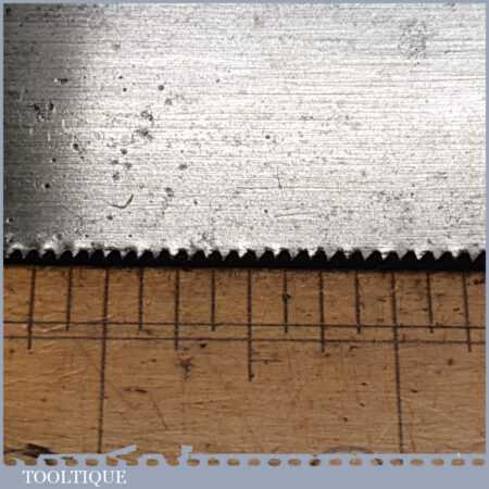 The saw has been thoroughly cleaned, jointed, resharpened and set by hand so that all the hard work of getting an old vintage saw right has been undertaken. We do this so that the next sharpening is easier and no more than a quick freshen up would be required. Those who are familiar with sharpening will know this is no small job and requires skill, effort and time to achieve good results.