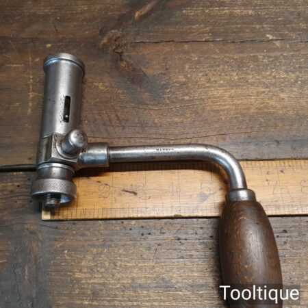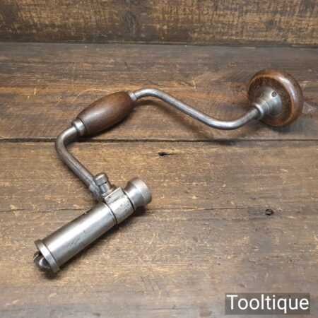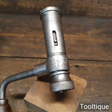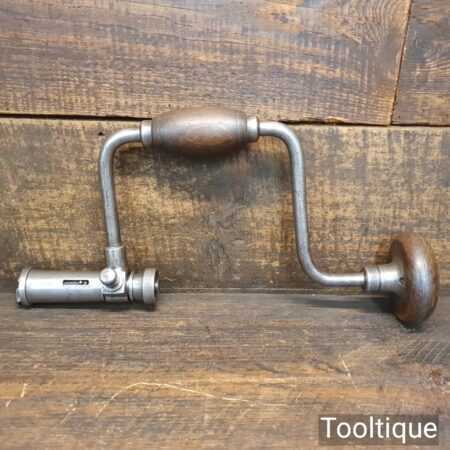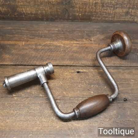 Rare antique Hanred of Germany carpenter’s 2-jaw ratchet brace with beechwood handles and a 10” swing, in good used condition. This has an unusual ratchet mechanism and works well.