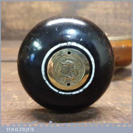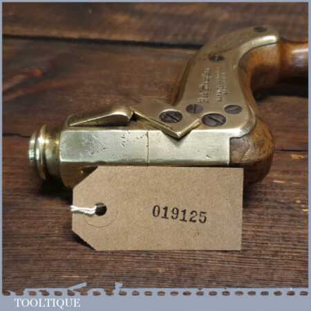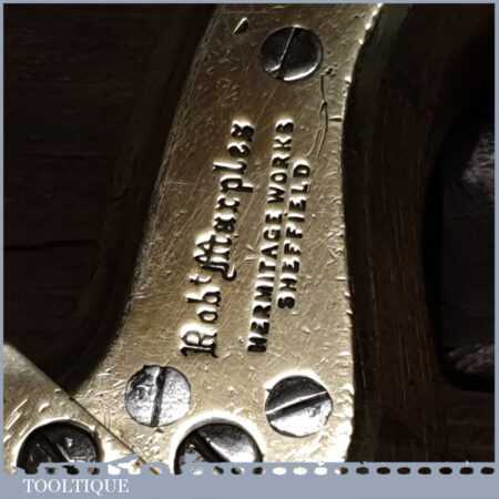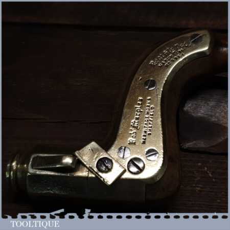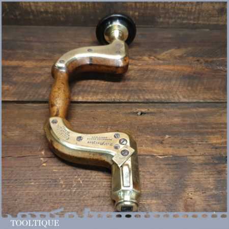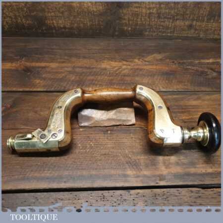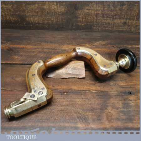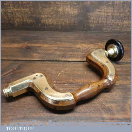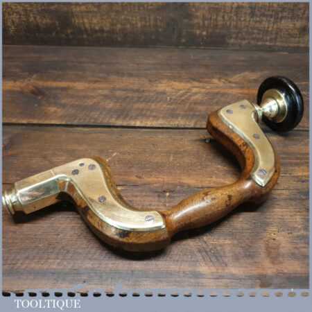Rare antique Robt. Marples heavily brass plated beechwood brace dated 1857 with ebony knob and unusual lever release, in good used condition. The brace knob isn’t loose and rotates smoothly and has its ivory ring.