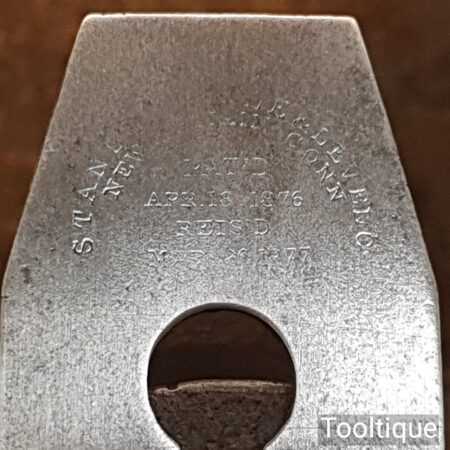 Type 1 – (1877 to 1880) Has an ornate front knob with “Stanley Rule Level Co.” and “Patented September 25,1877 in a circular border. The cutter is stamped “Stanley Rule & Level Co., New Britain, CT” and “Pat’d April 18,1876” and “Regs’d Mar. 20, 1877.” Screw down lever cap with fancy cap screw. The cutter has a special two-piece screw to join it with the cap iron. This special screw fits into a cutter adjustment with two apertures. The cutter adjustment wheel on the side of the plane is solid and has a japanned finish. The two small pieces of steel that are hinged and riveted to the front and back of the flexible sole are pointed toward the centre of the plane resembling the shape of a shield. Sargent’s 6/17/1879 patent date is stamped on the dovetailed lug attaching the sole to the body of the plane.