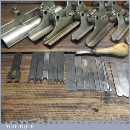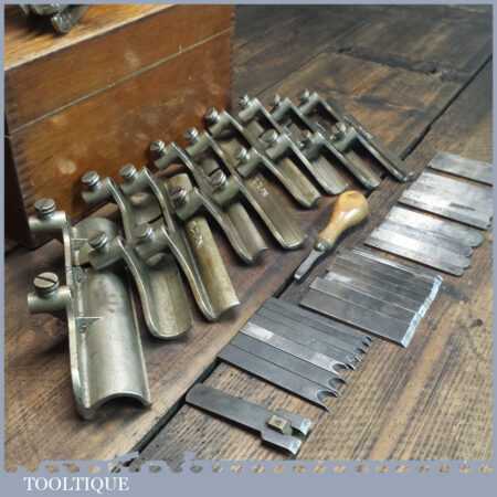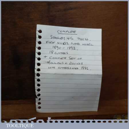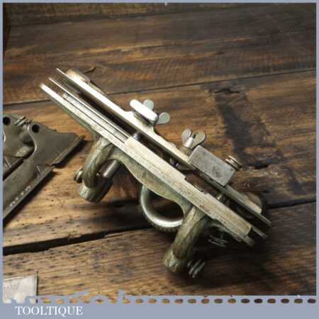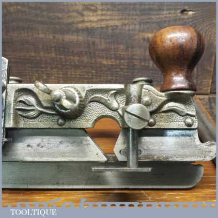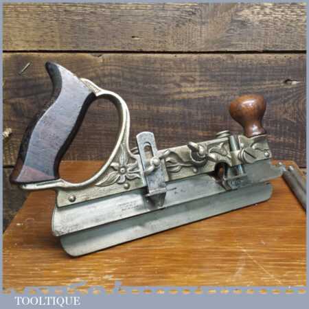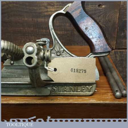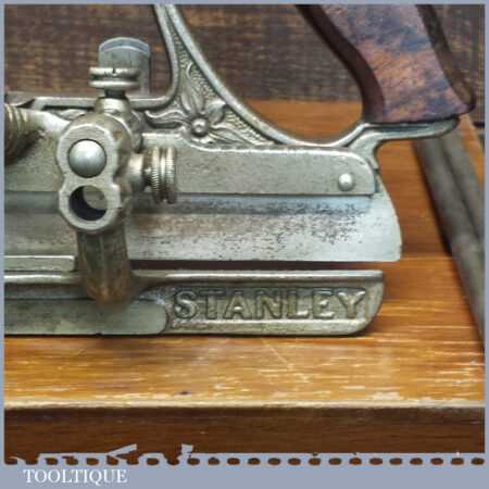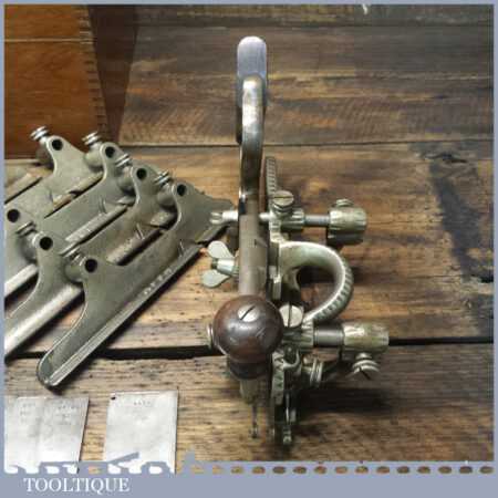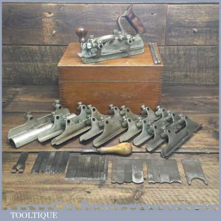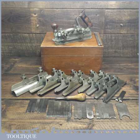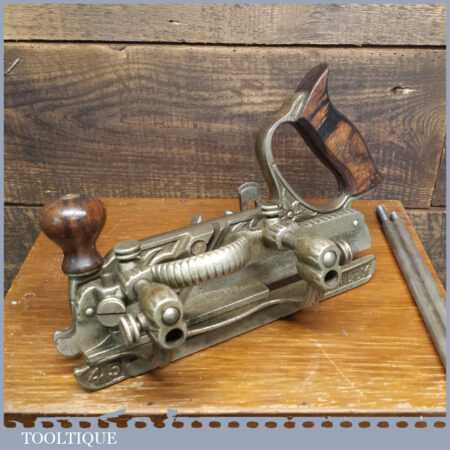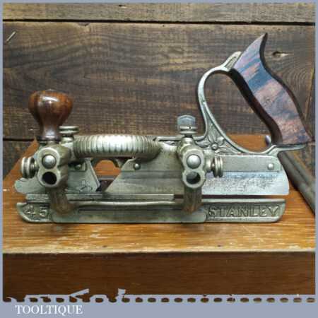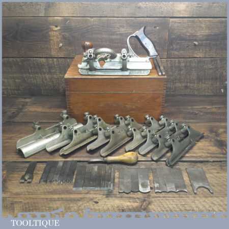 Rare boxed antique Type 4 Stanley Rule & Level Co. USA No: 45 combination plough plane complete with extra pat dated cutters and rare set of hollow and round fences, including the nosing fence, the normal cutters had no date stamp. Produced between 1890-92 and was the first nickel plated model. The plane is in good original condition and is a very rare find indeed.