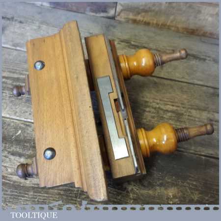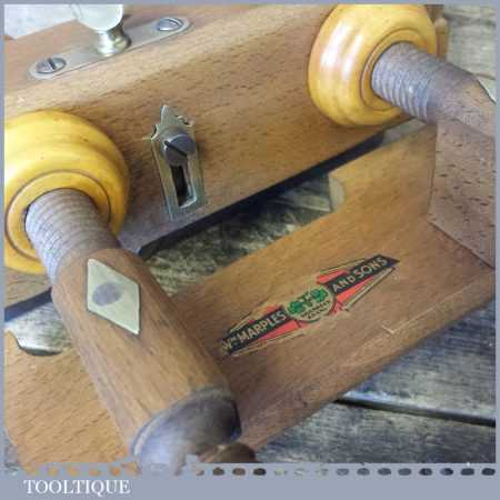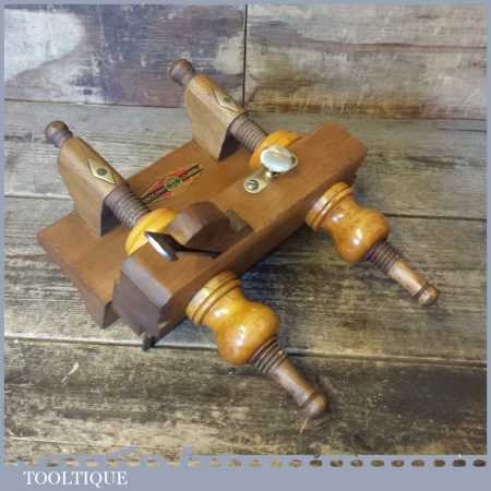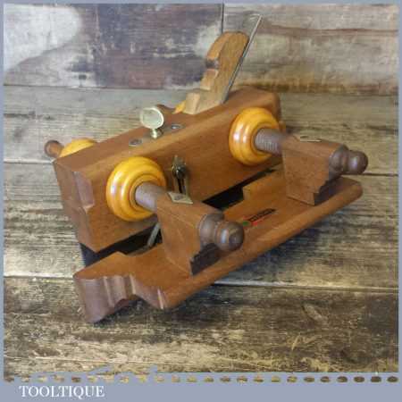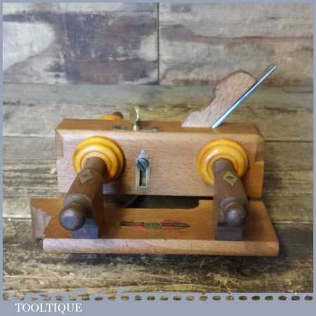 Rare Crisp Vintage Marples and Sons screw stem beech wood plough plane with boxwood adjusters, complete with its original decal. Note: The main threads are in good condition with only minor chips and adjusts as it should.