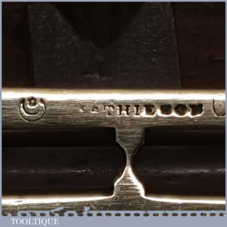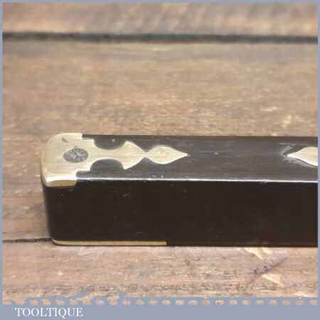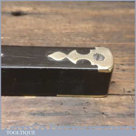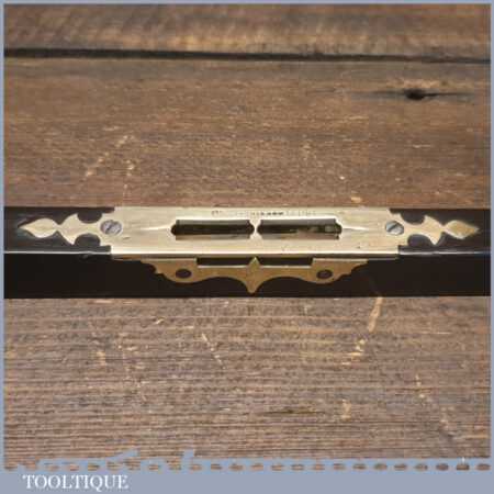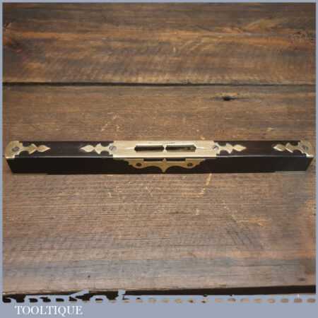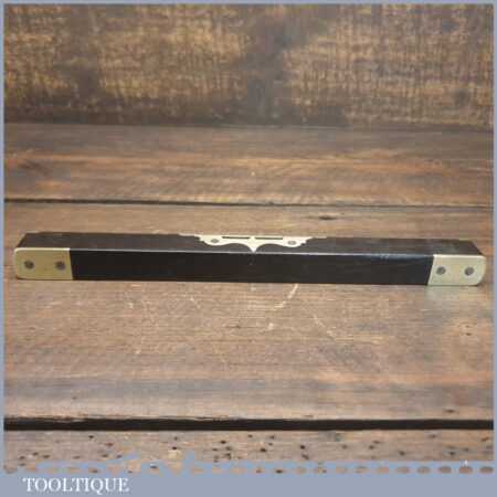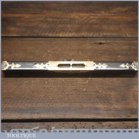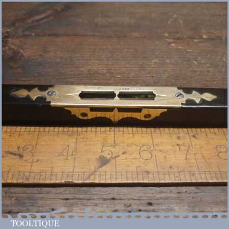 Rare ornate No: 014C vintage Alex Mathieson & Son 10” ornate brass and ebony spirit level with original clear bubble tube and in good used condition. Note: The glass vial bubble has been changed in its lifetime and evidence can be seen around the edges of the top plate where it has been removed, still it’s still a lovely level.