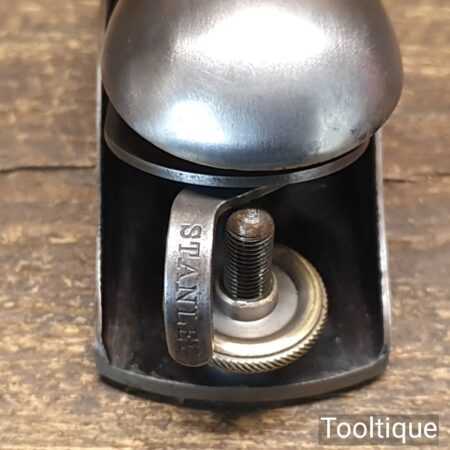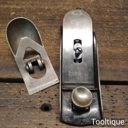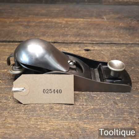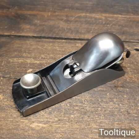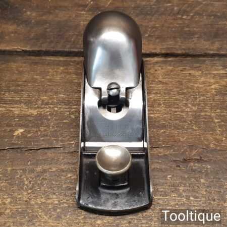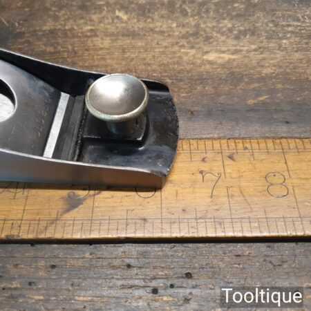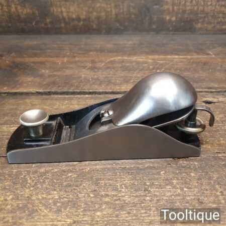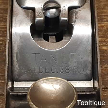 Rare Type 1 Stanley Rule & Level Co. USA No: 18 adjustable throat block plane with a knuckle joint lever cap in very good used condition. PAT dates on lateral adjustment lever are: 02-08-76, 10-02-84, 1-17-88, 17-24-88. Refined refurbishment making it suitable for use but is a rare example dating to around 1888 when the throat didn’t have the adjustment mechanism and had to be adjusted manually.