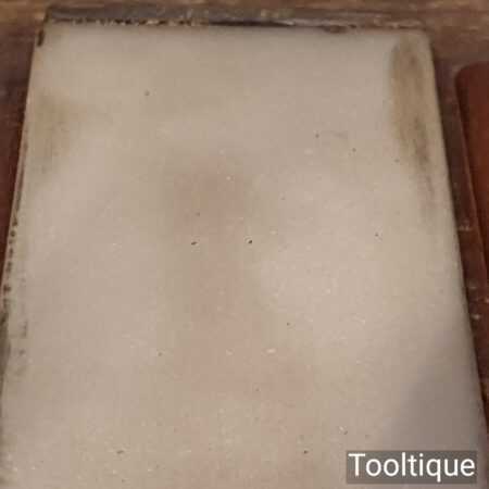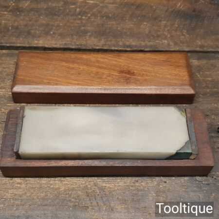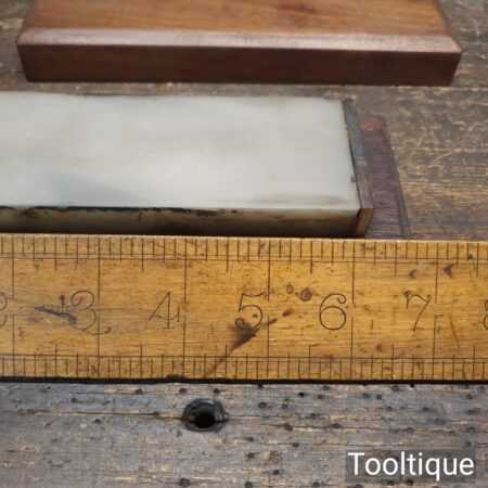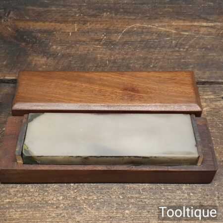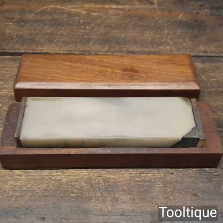 Rare Vintage 6” x 2” x 1” Natural Fine Arkansas lily-white Honing stone in mahogany box. Note: two chips on corners (Resin Filled) but will not affect its usability, The stone has been lapped flat ready for use. Suitable for use with a good quality lapping fluid, see our Acutus Brand in store.