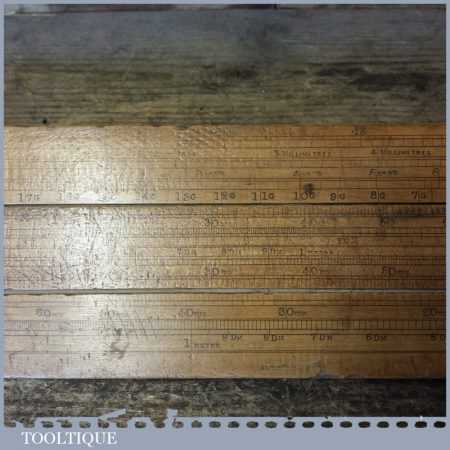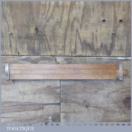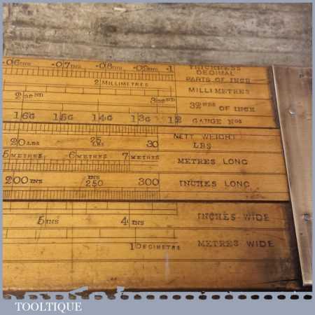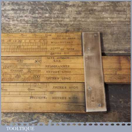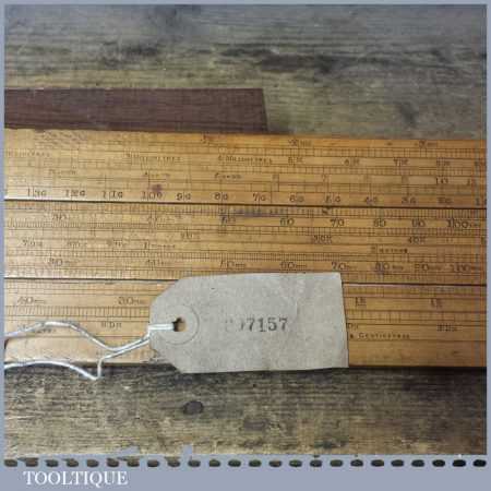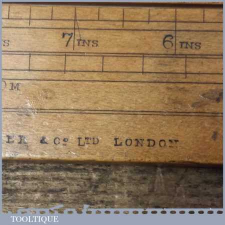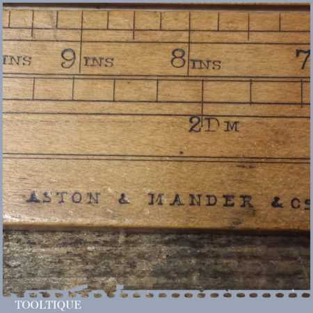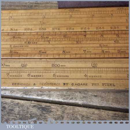 Rare vintage 26 1/2″ long boxwood & brass mathematical sliding rule for calculating steel weight and seems to be a rare type for this maker. It was registered and Designed by C Hoare for Steel and made by Aston Mander who were mathematical instrument maker & Slide rule makers who traded at 25 and later 61 Old Compton Street works, Soho & Homerton, both places where in London. The Partnership, initially between Isaac Aston (w.1851-1870) & George Mander (1833-1870) was succeeded by Aston & Mander Co. Ltd in the 1900’s until closing around 1939. Note: There is a couple of small cracks to the end of the wood.