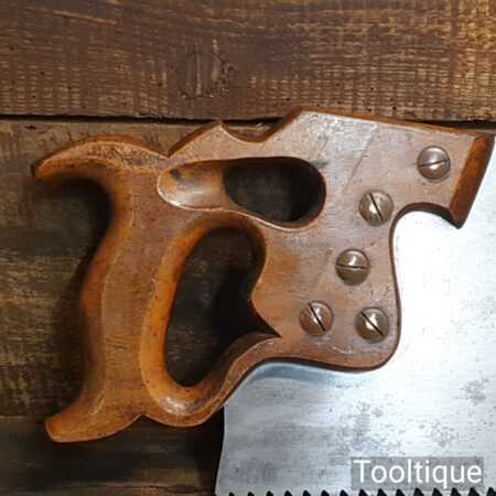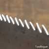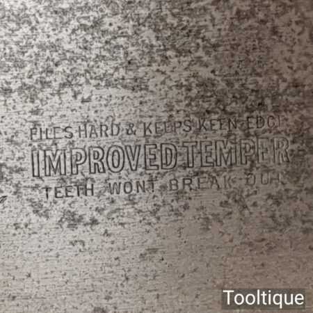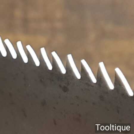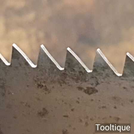 The saw has been thoroughly cleaned, jointed, resharpened and set by hand so that all the hard work of getting an old vintage saw right has been undertaken. We do this so that the next sharpening is easier and no more than a quick freshen up would be required. Those who are familiar with sharpening will know this is no small job and requires skill, effort and time to achieve good results.