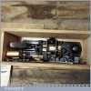 Rare vintage Stanley USA No: 193 fibre board cutter plane complete with a full set of cutters, in a nice beechwood box and in good used condition. Note: crack in the rosewood tote that has remnants of the original decal and original jappaning.