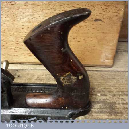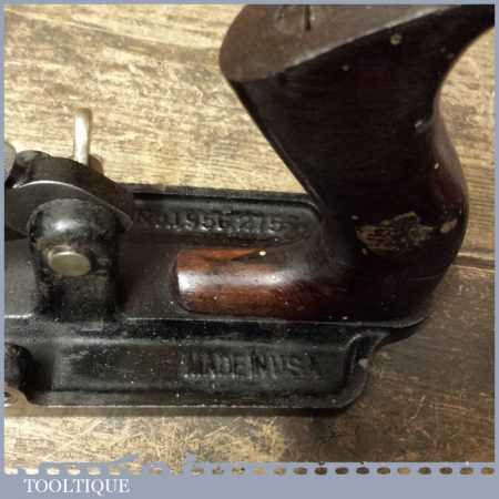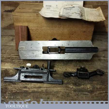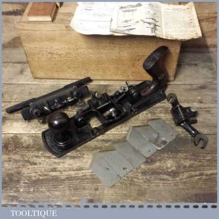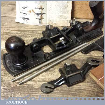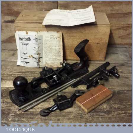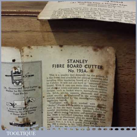 Rare vintage Stanley USA No: 193 fibre board cutter plane complete with a full set of cutters, in a nice beechwood box and in good used condition. Note: crack in the rosewood tote that has remnants of the original decal and original jappaning.